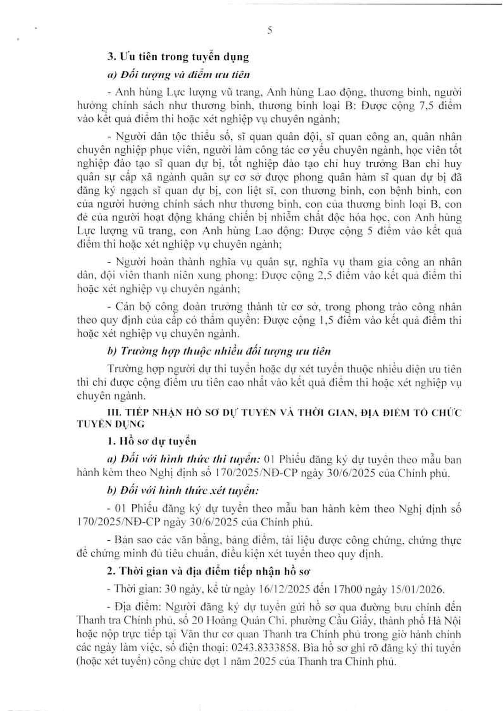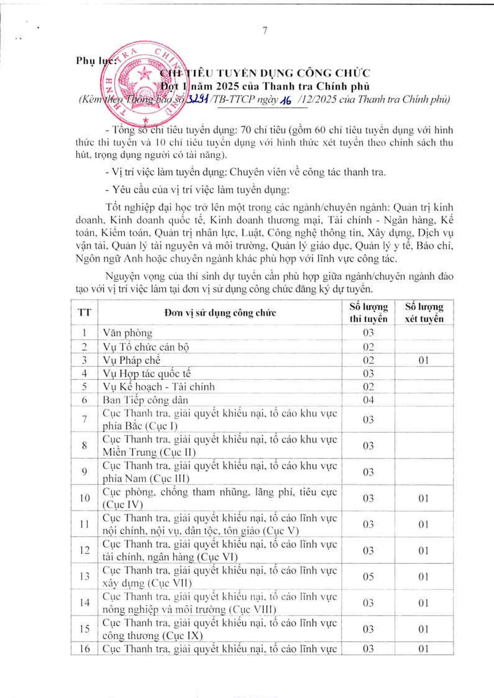 (Thanh tra) - Thông báo tuyển dụng công chức 2025 của Thanh tra Chính phủ (đợt 1)