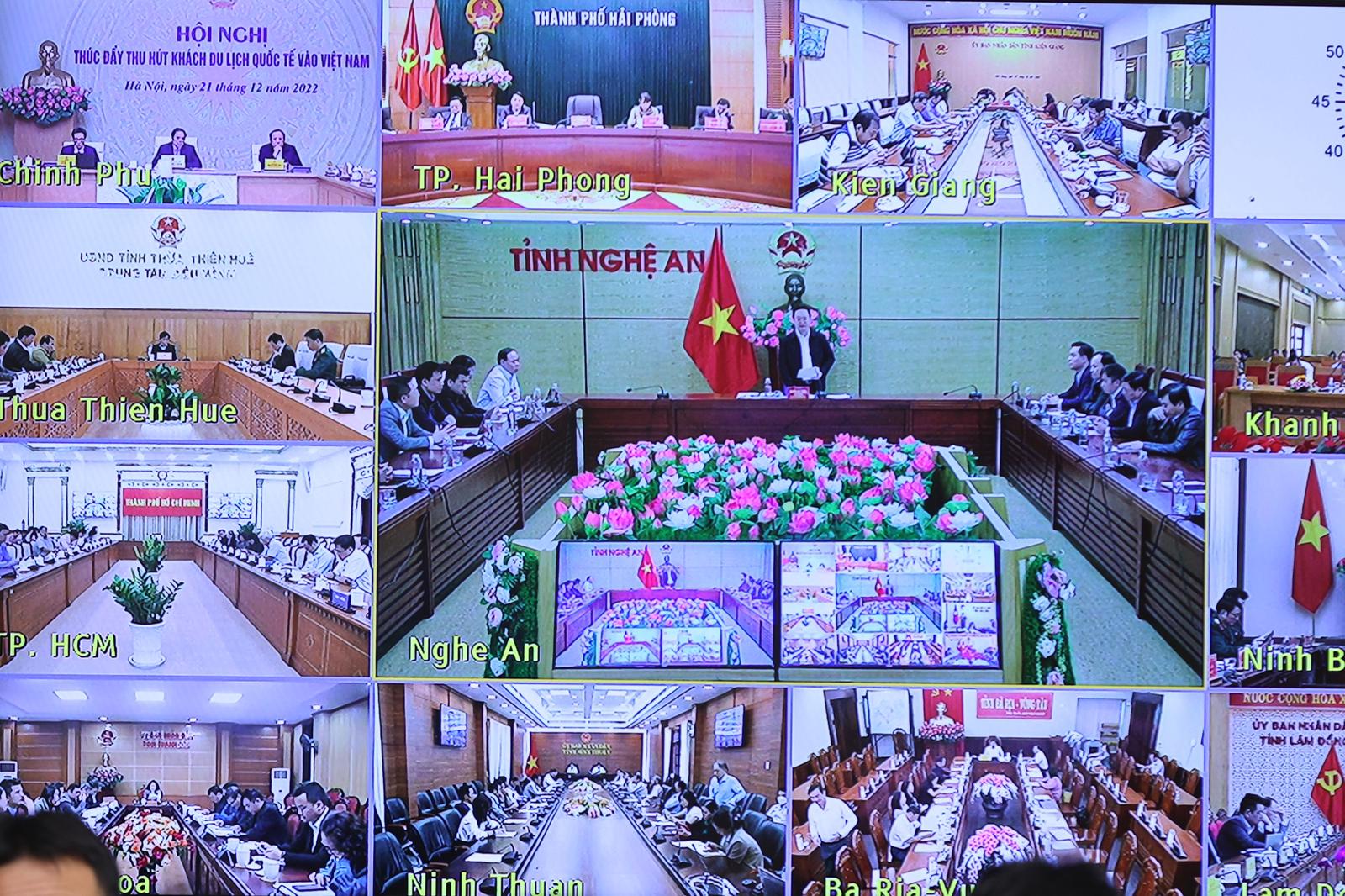 Hội nghị được tổ chức theo hình thức trực tiếp kết hợp trực tuyến giữa đầu cầu Trụ sở Chính phủ với đầu cầu 20 tỉnh, thành phố trực thuộc Trung ương, nơi có các điểm du lịch thu hút khách quốc tế