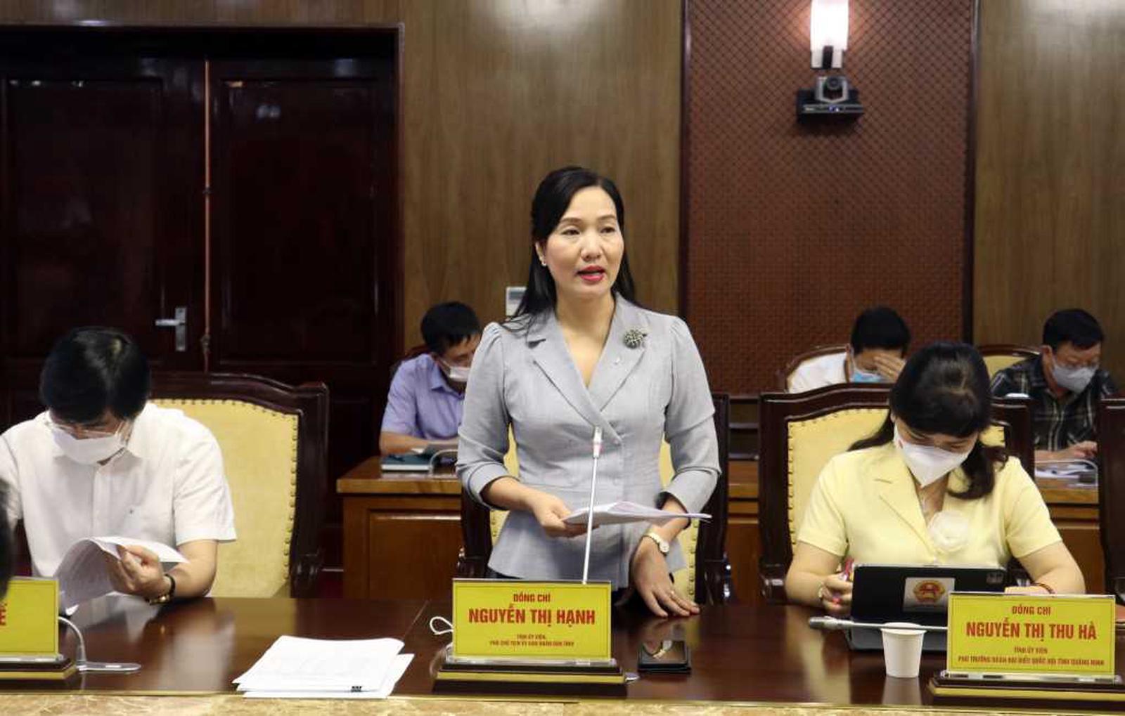 Phó Chủ tịch UBND tỉnh Quảng Ninh Nguyễn Thị Hạnh báo cáo công tác phòng chống dịch Covid-19 tại cuộc họp. Ảnh: TTTT