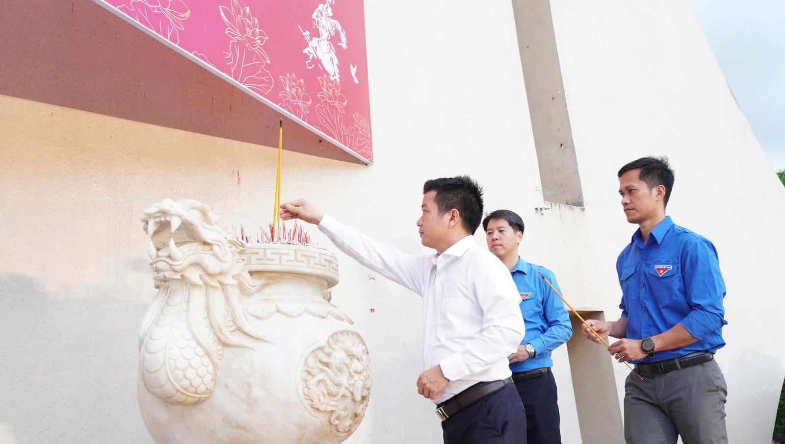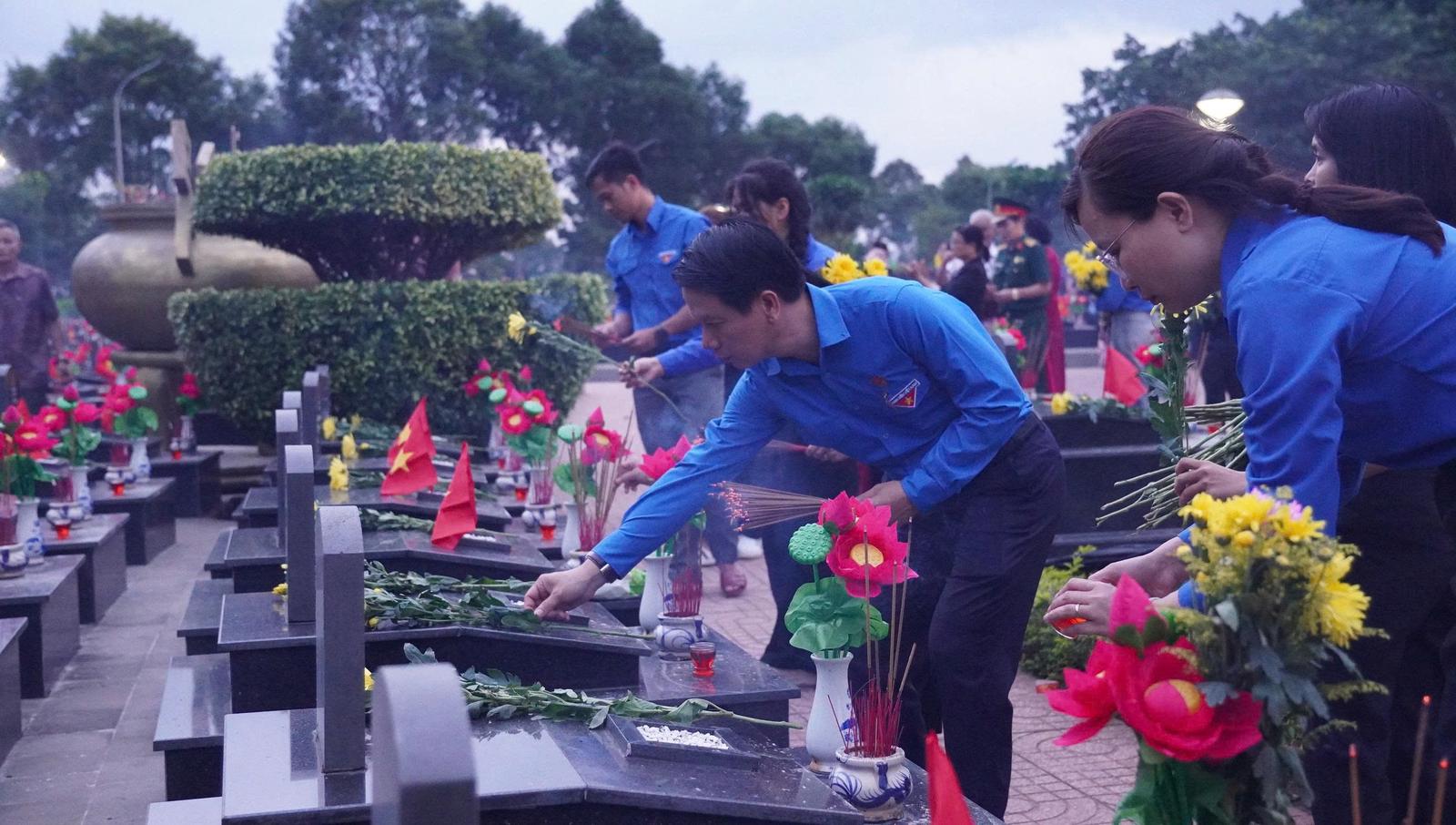 Đoàn viên, thanh niên thành kính đặt hoa và thắp hương trên mộ liệt sĩ. Ảnh: DK