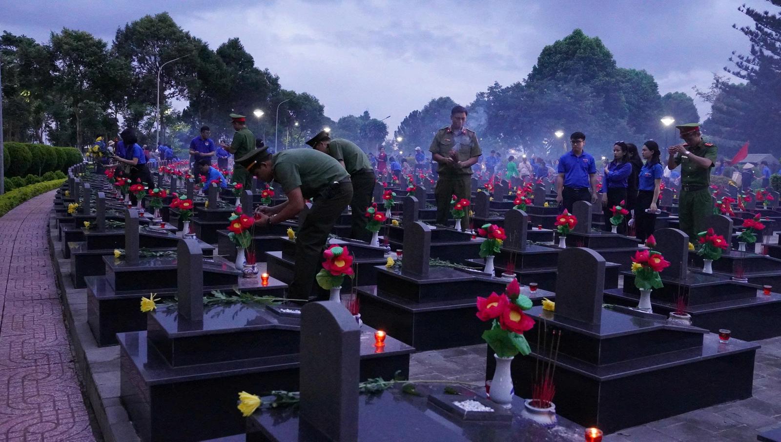 Tiếp đó, hàng ngàn ngọn nến lung linh cùng hoa tươi và nén hương thơm đã được thắp sáng trên 2.300 phần mộ tại nghĩa trang, nơi yên nghỉ của những người con ưu tú của quê hương, đất nước đã anh dũng hy sinh vì độc lập tự do của Tổ quốc và nghĩa vụ quốc tế cao cả.