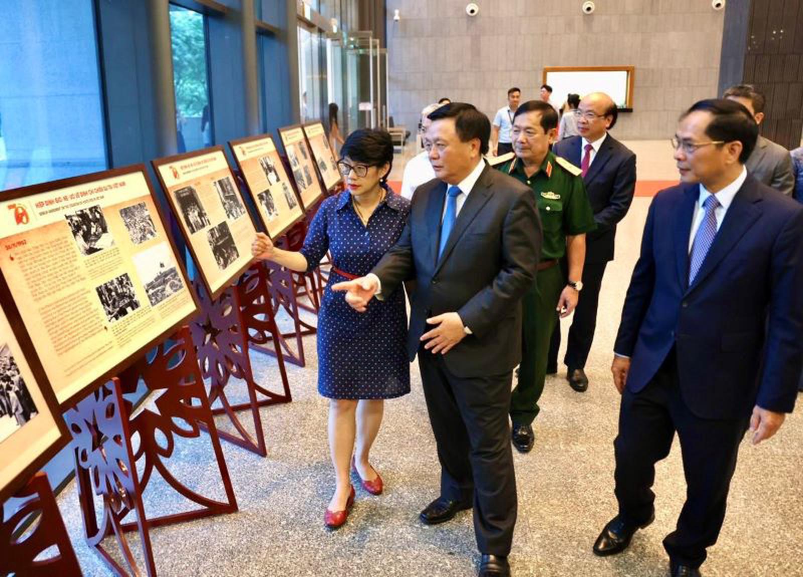 GS.TS Nguyễn Xuân Thắng, Giám đốc Học viện Chính trị Quốc gia Hồ Chí Minh, Chủ tịch Hội đồng Lý luận Trung ương và Bộ trưởng Ngoại giao Bùi Thanh Sơn cùng đại biểu tham quan trưng bày ảnh tại hội thảo. Ảnh: Lâm Khánh