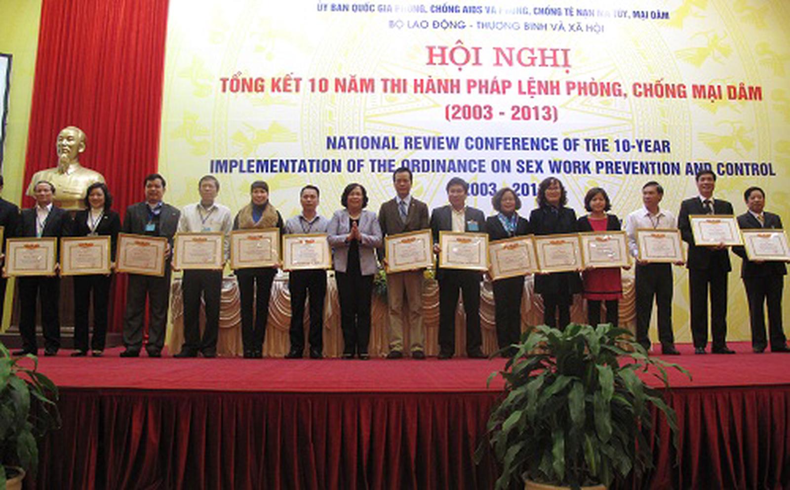 Nhân dịp này, Bộ trưởng Bộ LĐ-TBXH Phạm Thị Hải Chuyền đã tặng Bằng khen cho 38 tập thể và 46 cá nhân thuộc các bộ, ban ngành và các tỉnh, thành phố trực thuộc Trung ương đã có thành tích xuất sắc trong thực hiện Pháp lệnh Phòng chống mại dâm giai đoạn 2009 - 2014.