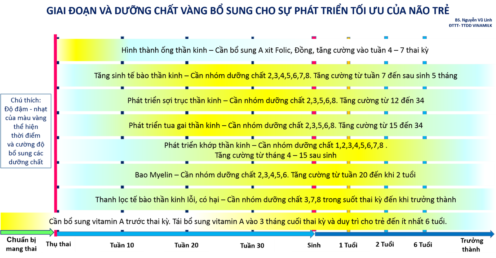 Là những dưỡng chất cần thiết cho cả mẹ và con trong quá trình chuẩn bị, mang thai và những năm tháng sau sinh. Chúng phải được cung cấp đúng, đủ, đều (đúng về thời gian, đủ về liều lượng và đều về tần xuất). Nếu để lỡ nhịp hay khiếm khuyết các yếu tố nêu trên thì không có cơ hội thứ hai cho sự phát triển tối ưu hệ thần kinh của trẻ. Dưỡng chất vàng gồm 8 nhóm sau: