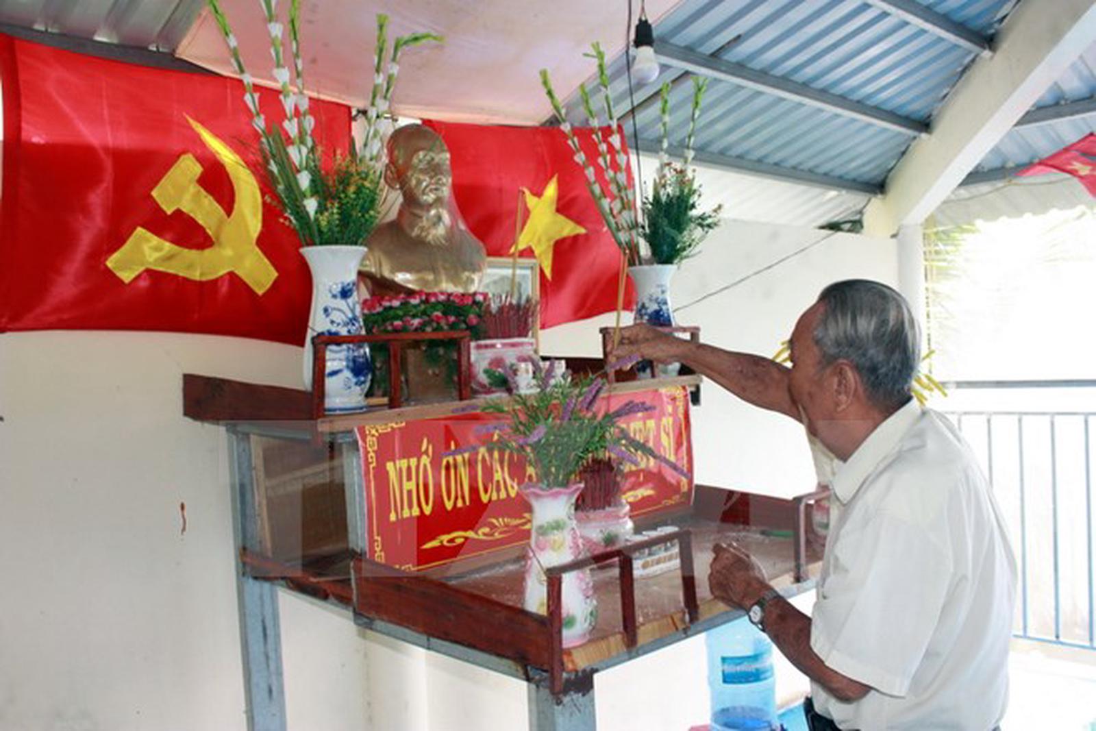 Ông Sơn thắp hương trong nhà thờ Bác của gia đình. (Ảnh: Lê Sen/TTXVN)