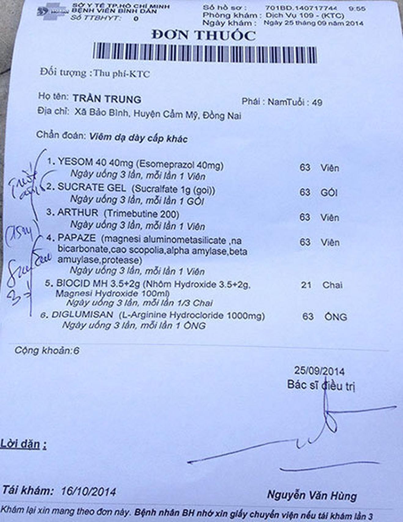 Ông Trung được bác sĩ Nguyễn Văn Hùng chẩn đoán “viêm dạ dày cấp khác”, kê toa sáu loại thuốc với giá 4,8 triệu đồng.