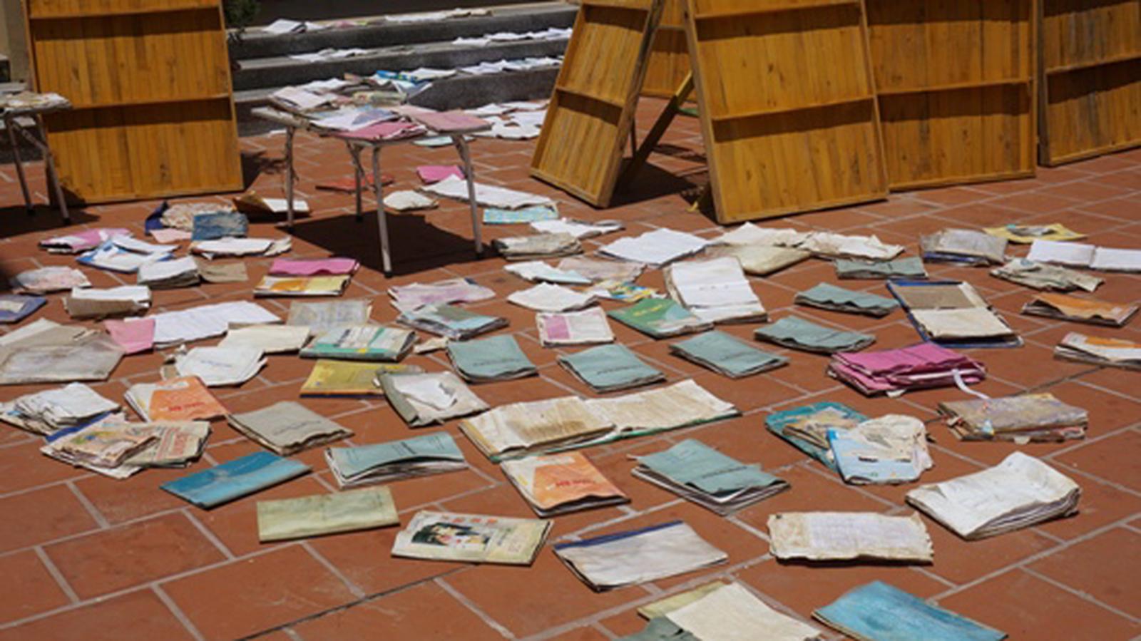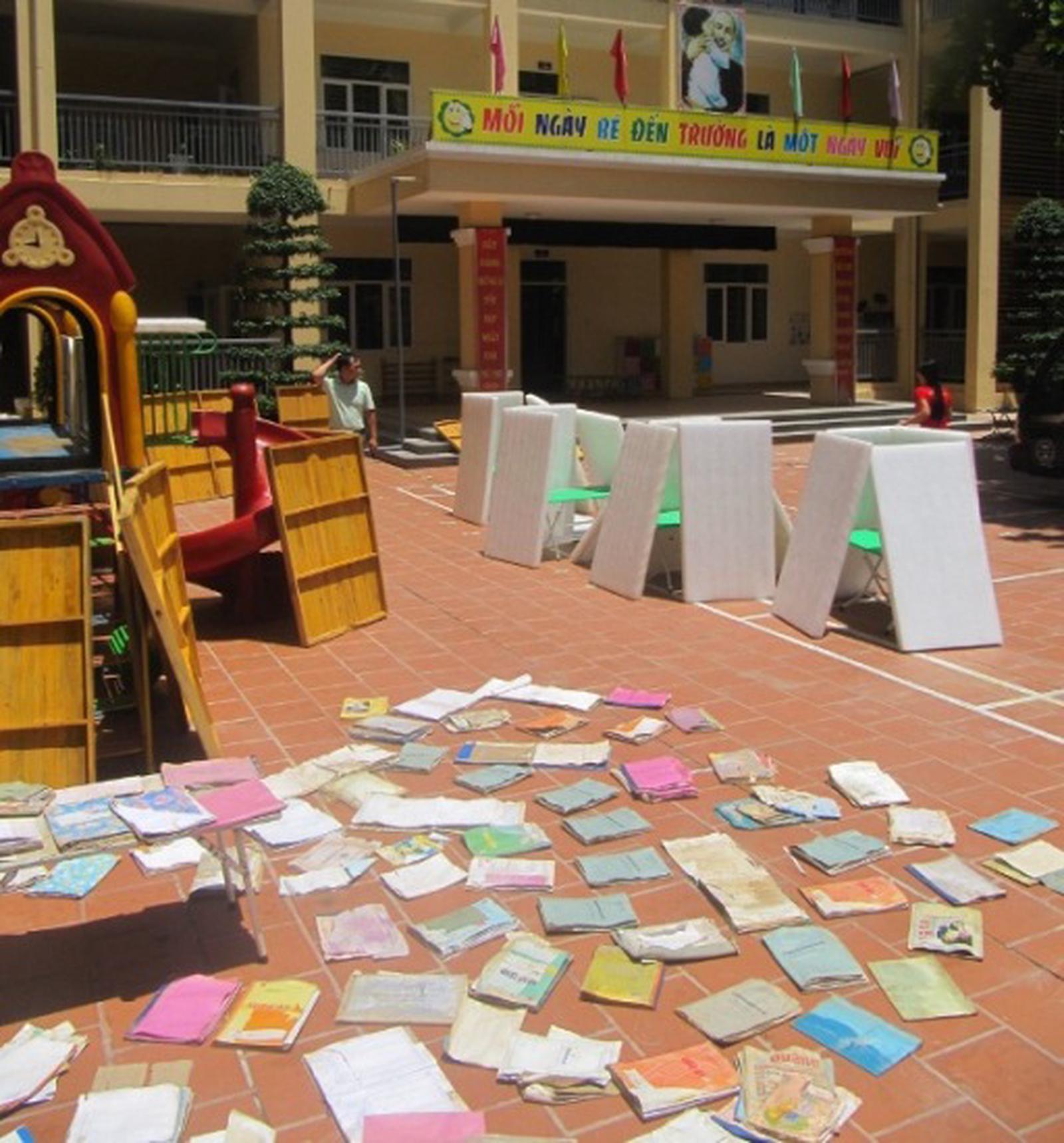 Sách vở, đồ dùng vẫn phơi ngổn ngang trên sân trường.