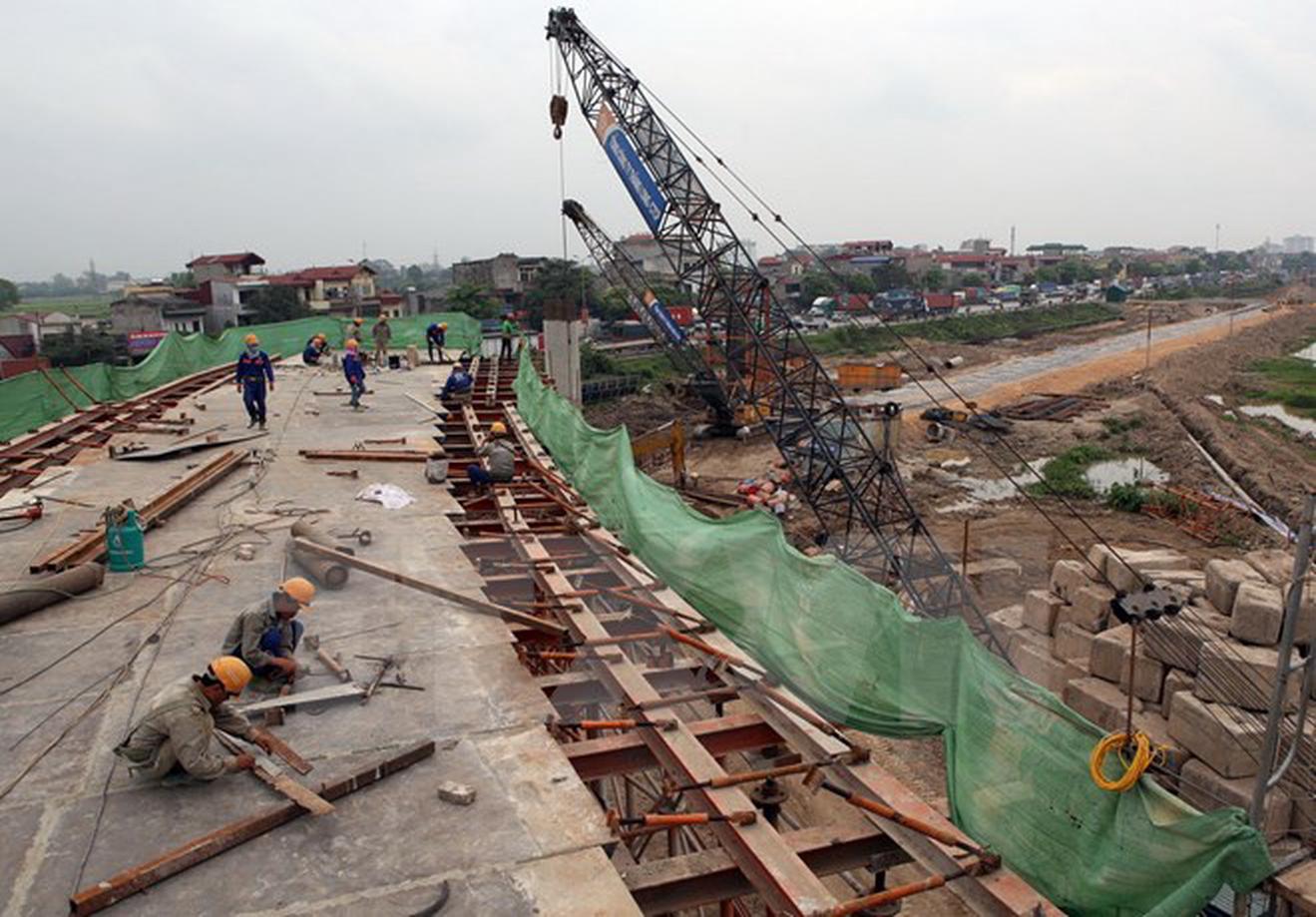 Công nhân làm việc tại một nhánh của nút giao cầu Thanh Trì-Quốc lộ 5. (Ảnh: TTXVN)