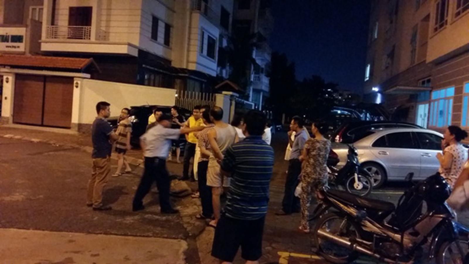 Dù đã bị cư dân mời ra khỏi tòa nhà từ sáng ngày 2/7, nhưng đến 22 giờ cùng ngày, một tốp bảo vệ của Cty Thanh Bình vẫn quay lại yêu cầu được vào tòa nhà trong sự phản đối kịch liệt của cư dân: Hợp đồng đã hết hạn, chúng tôi không thuê các anh nữa! Ảnh: QĐ