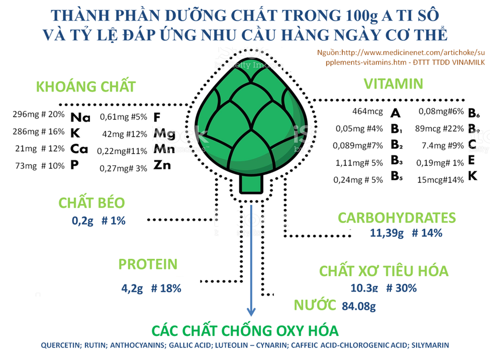 Vitamin và khoáng chất quan trọng: Trong 100g atisô (hoa) chứa khoảng 15 microgram Vitamin K, 90mcg Acxit folic (Folate), Vitamin C, magne, mangan, kali... Vitamin K trong atisô có tác dụng bảo vệ tế bào thần kinh khỏi các tổn thương và thoái hóa dó tuổi tác. Phòng ngừa bệnh mất trí nhớ tuổi già (Alzheimer). Ngoài ra, Vitamin K còn có các tác dụng hỗ trợ quá trình máu đông – máu chảy, kết hợp với canxi giúp xương chắc khỏe, ngăn ngừa sỏi thận, giảm xơ hoá động mạch, giảm bệnh tiểu đường.
