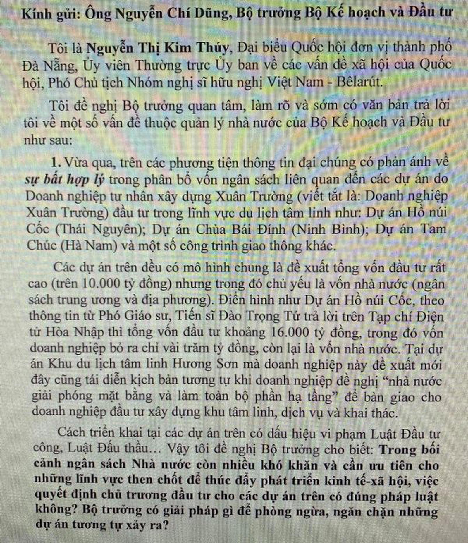 ĐBQH Nguyễn Thị Kim Thúy đã có văn bản gửi Bộ trưởng Bộ Kế hoạch và Đầu tư đề nghị làm rõ, trả lời một số vấn đề liên quan đến một số dự án của DN Xuân Trường