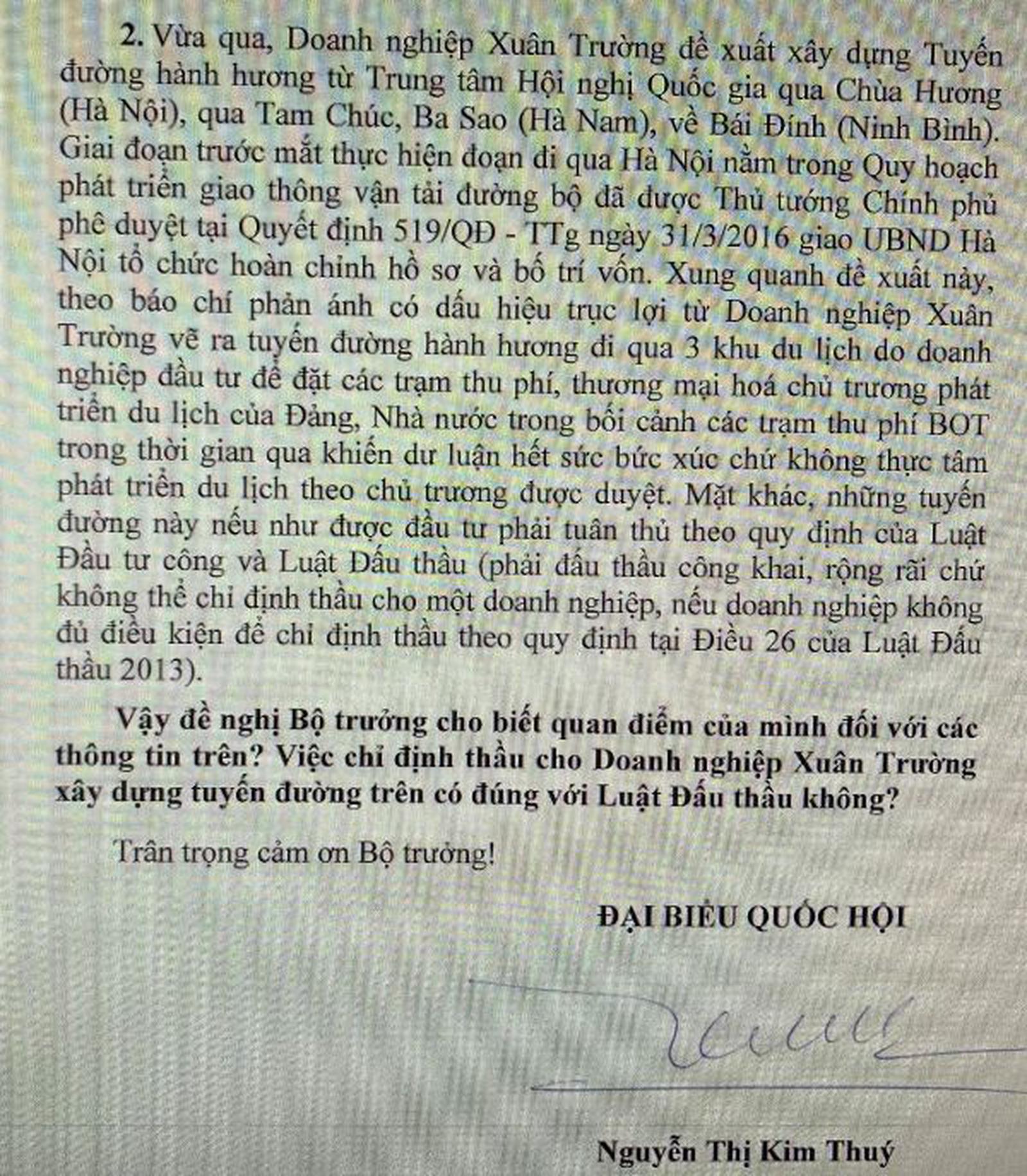 Tại văn bản, đại biểu còn đặt vấn đề, vừa qua, DN Xuân Trường đề xuất xây dựng Tuyến đường hành hương từ Trung tâm Hội nghị Quốc gia qua Chùa Hương (Hà Nội), qua Tam Chúc, Ba Sao (Hà Nam), về Bái Đính (Ninh Bình). Giai đoạn trước mắt thực hiện đoạn đi qua Hà Nội nằm trong Quy hoạch phát triển giao thông vận tải đường bộ đã được Thủ tướng Chính phủ phê duyệt tại Quyết định 519/QĐ-TTg ngày 31/3/2016, giao UBND TP Hà Nội tổ chức hoàn chỉnh hồ sơ và bố trí vốn. Xung quanh đề xuất này, theo báo chí phản ánh có dấu hiệu trục lợi từ DN Xuân Trường vẽ ra tuyến đường hành hương đi qua 3 khu du lịch do DN đầu tư để đặt các trạm thu phí, thương mại hoá chủ trương phát triển du lịch của Đảng, Nhà nước trong bối cảnh các trạm thu phí BOT trong thời gian qua khiến dư luận hết sức bức xúc chứ không thực tâm phát triển du lịch theo chủ trương được duyệt.