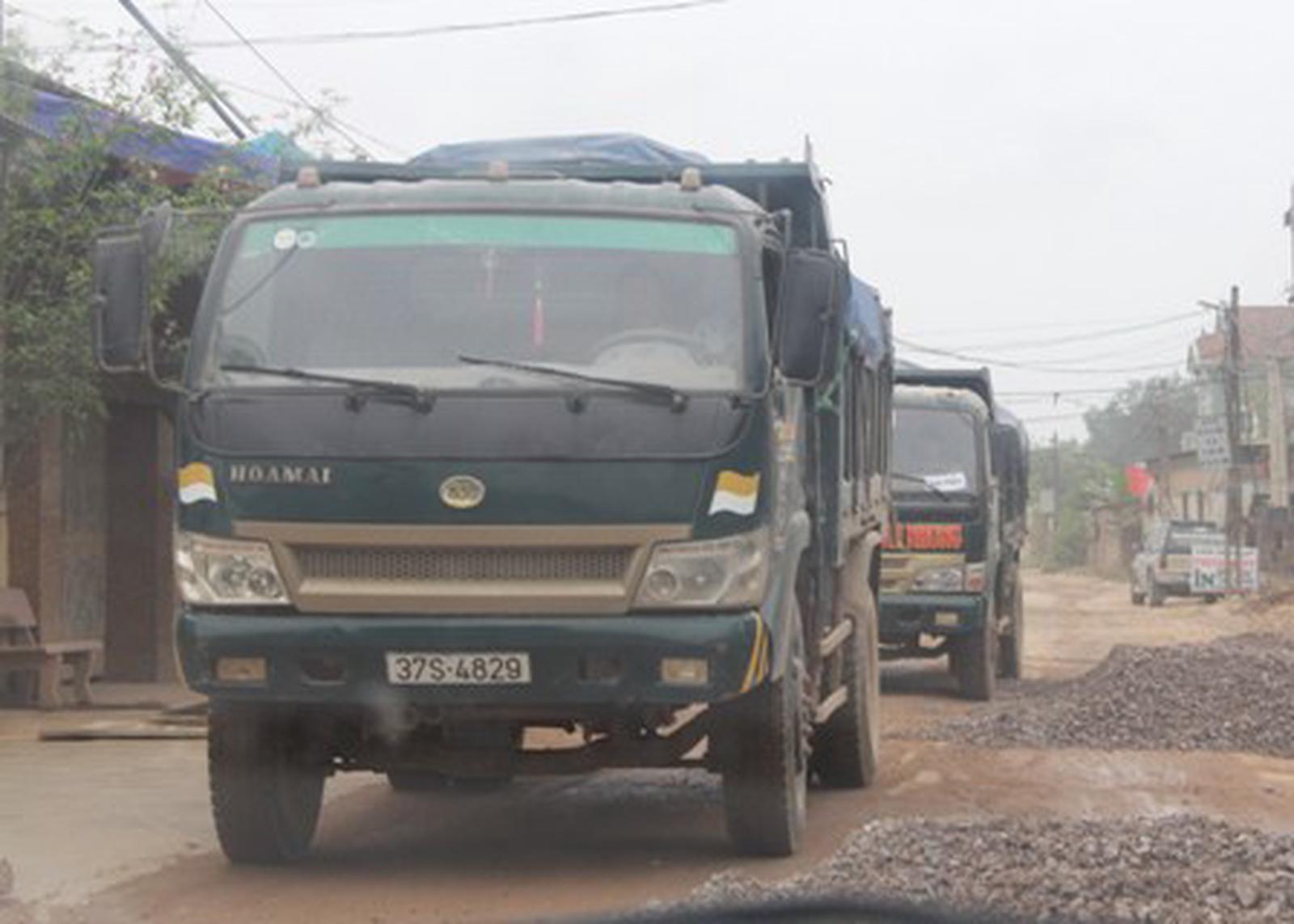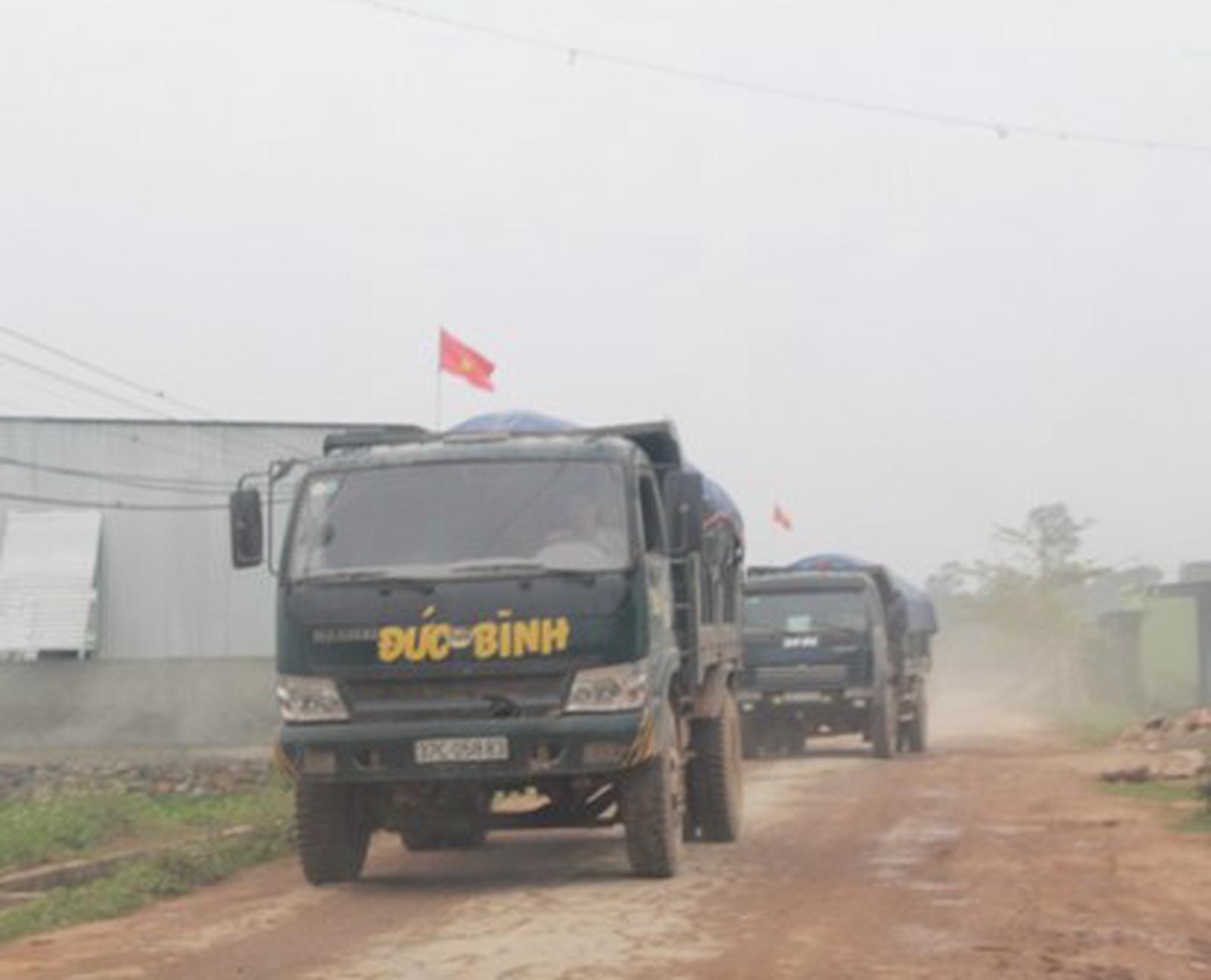 Dàn xe chở đá đang lưu thông trên tuyến đường đi qua xã Nam Thành. Ảnh: Lương Ý