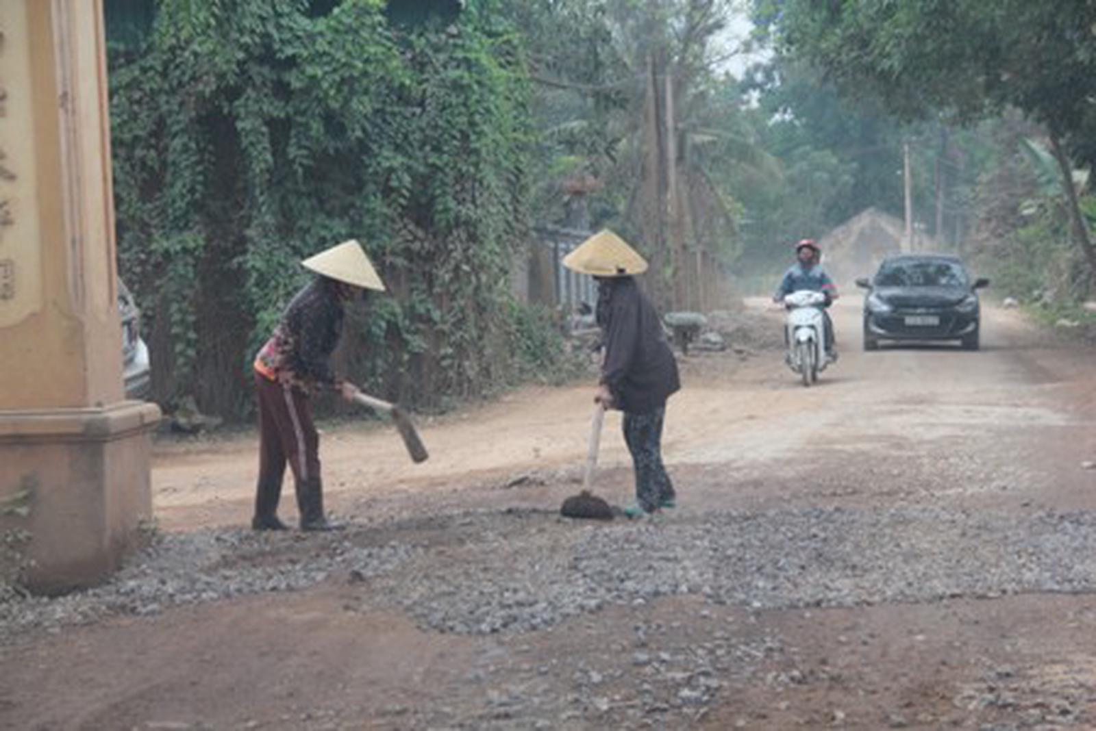 Một số người dân dùng cuốc tự san gạt lại đường, sau khi đường bị xe quá tải “cày nát”. Ảnh: Lương Ý
