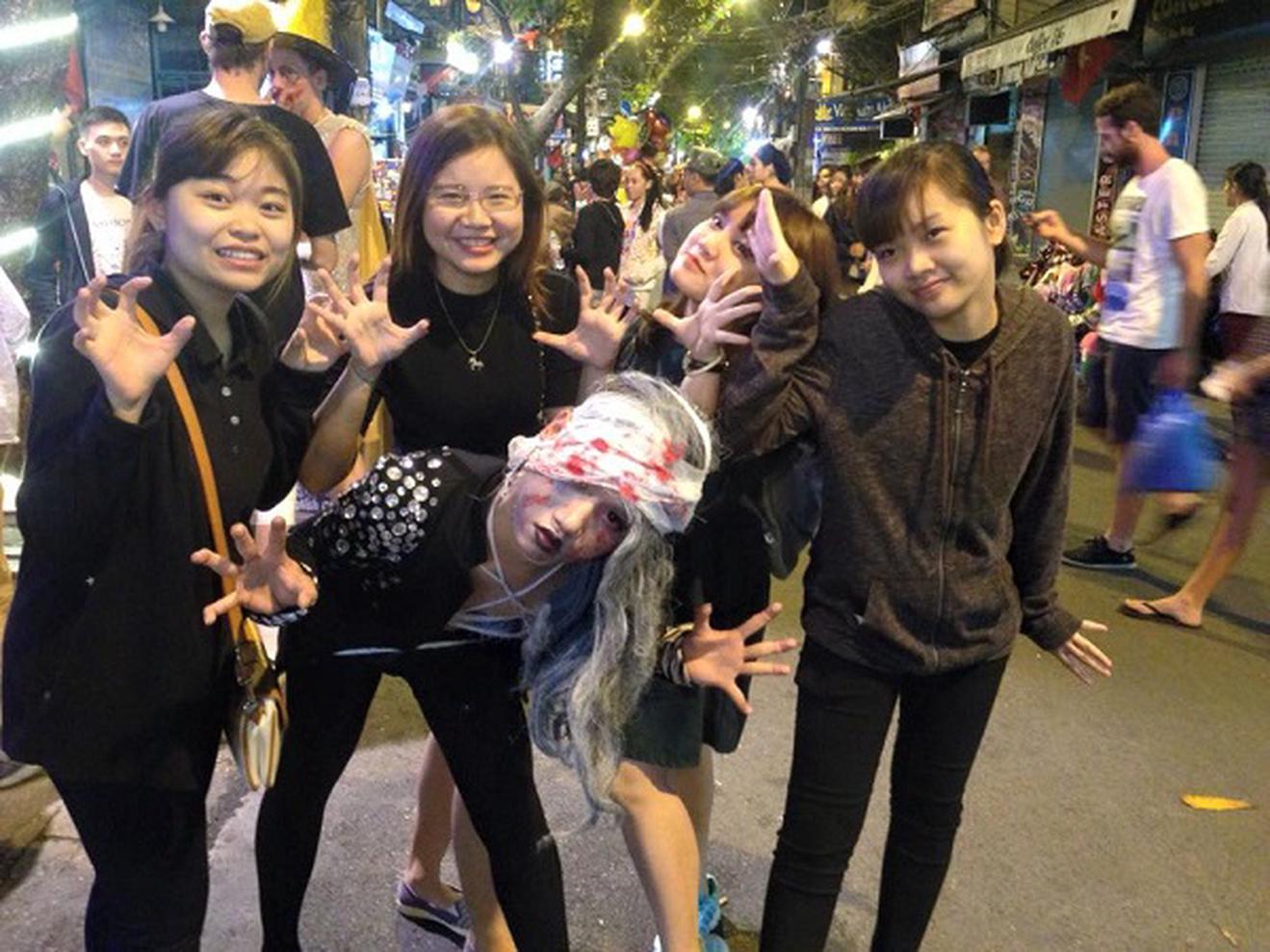 Nhóm bạn trẻ vui vẻ dạo chơi phố cổ trong Lễ hội Hóa trang. Ảnh: Thế Lữ