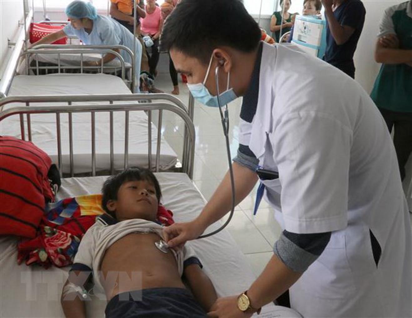 Các bác sỹ tại Bệnh viện Nhi tỉnh Gia Lai thăm khám cho em Đinh Đang bị ngộ độc do ăn thịt cóc. (Ảnh: Dư Toán/TTXVN)