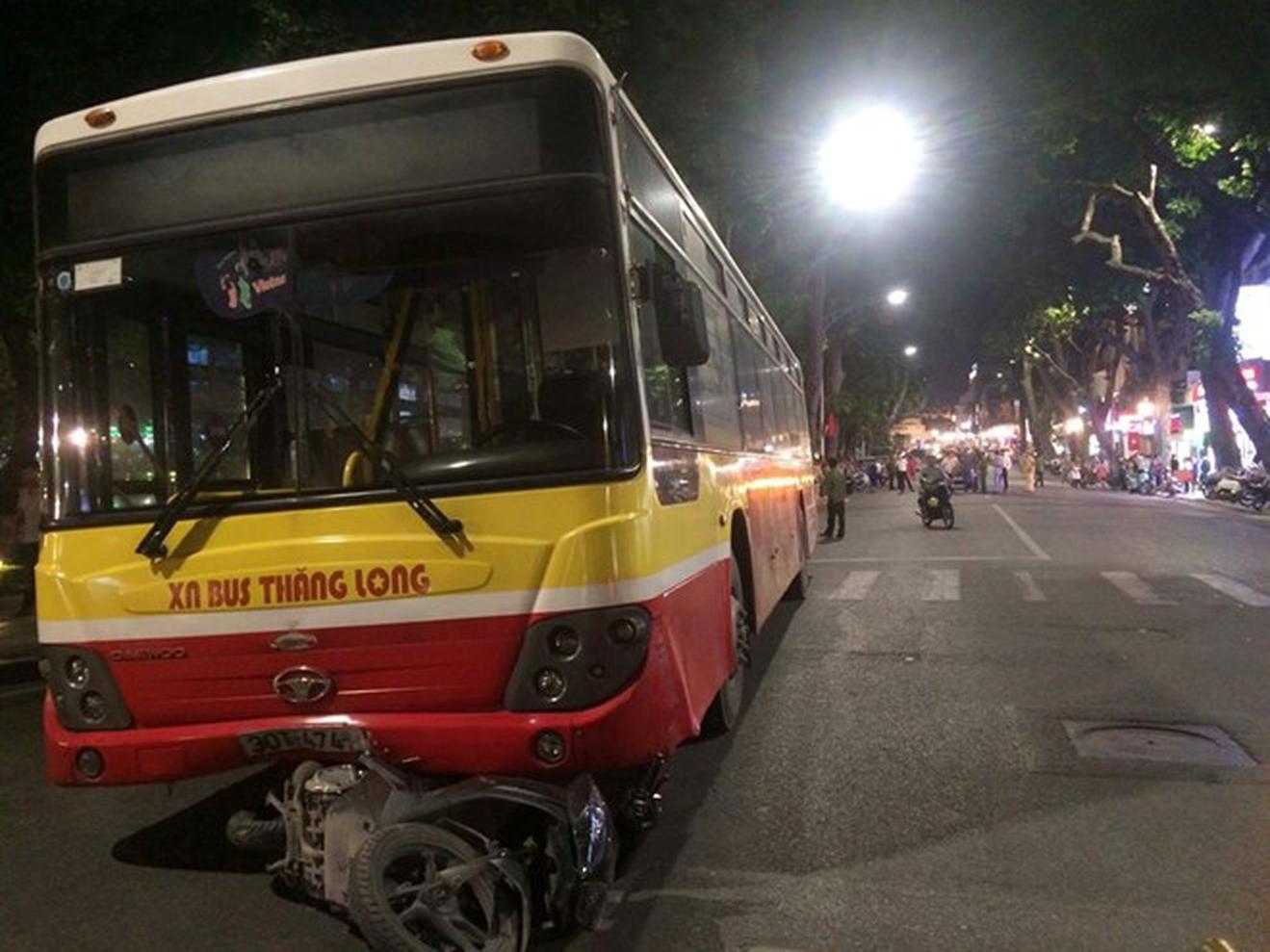 Sau va chạm liên hoàn, chiếc xe buýt tiếp tục lao hơn 30m rồi mới dừng lại được gần nút giao thông Tràng Thi-Bà Triệu, chiếc xe Air Blade của nạn nhân vẫn kẹt cứng ở mũi xe.