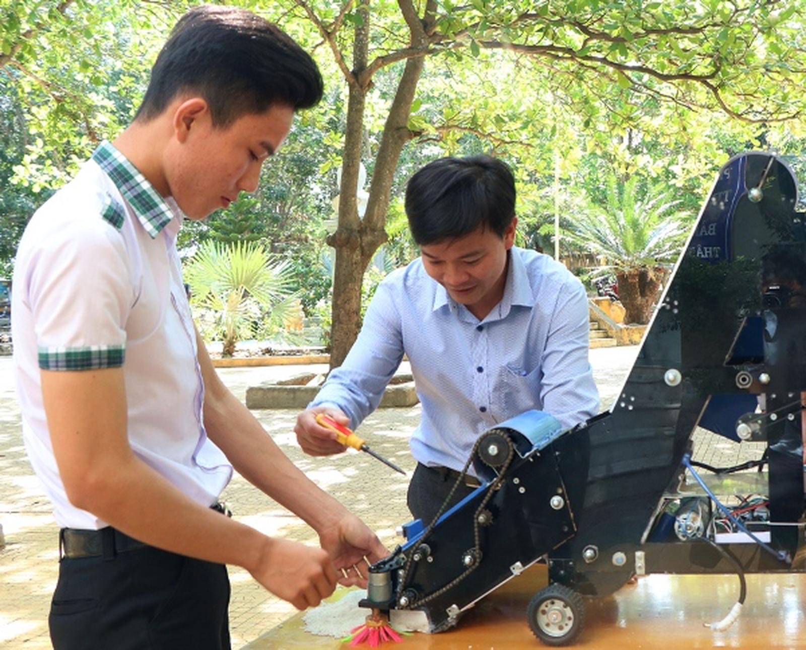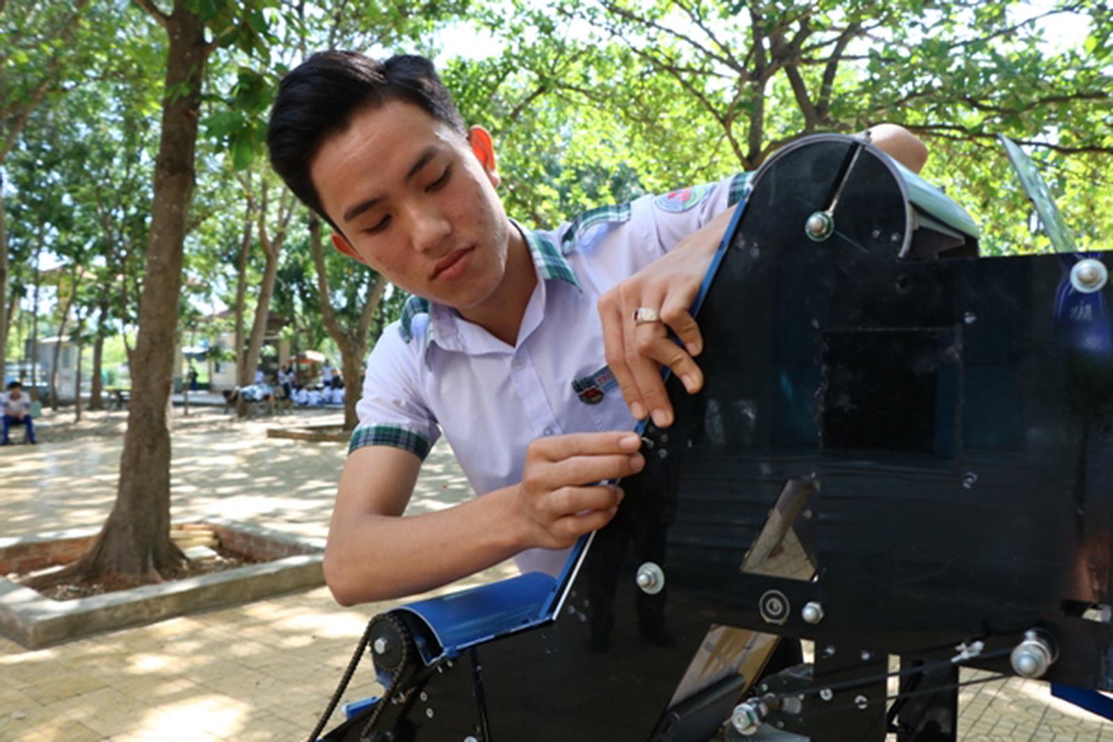 Em Nguyễn Hữu Thực chỉnh sửa mô hình máy thu gom nông sản của mình. Ảnh: Khoa Lê