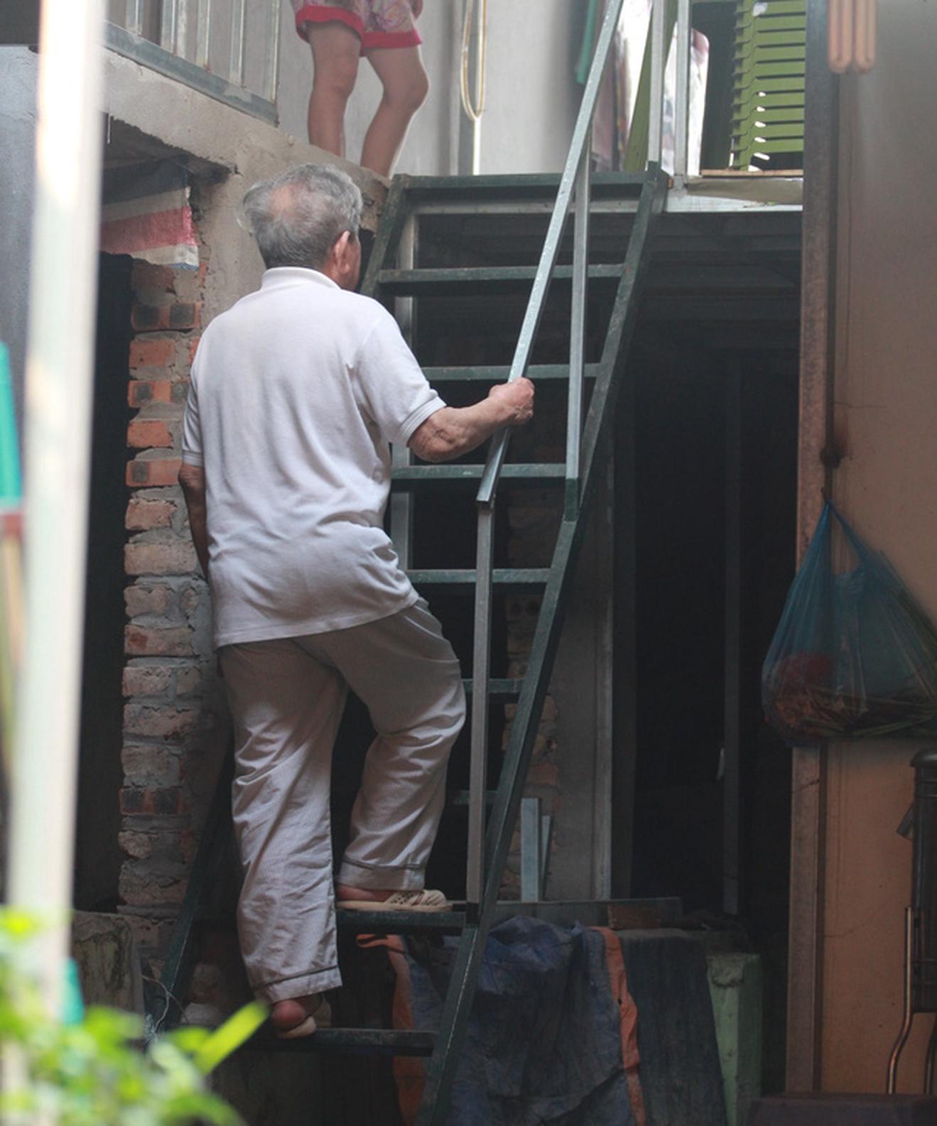 Mỗi lần muốn ra đường, ông Bổng (80 tuổi) và người nhà phải trèo chiếc thang cao 2,2 mét.