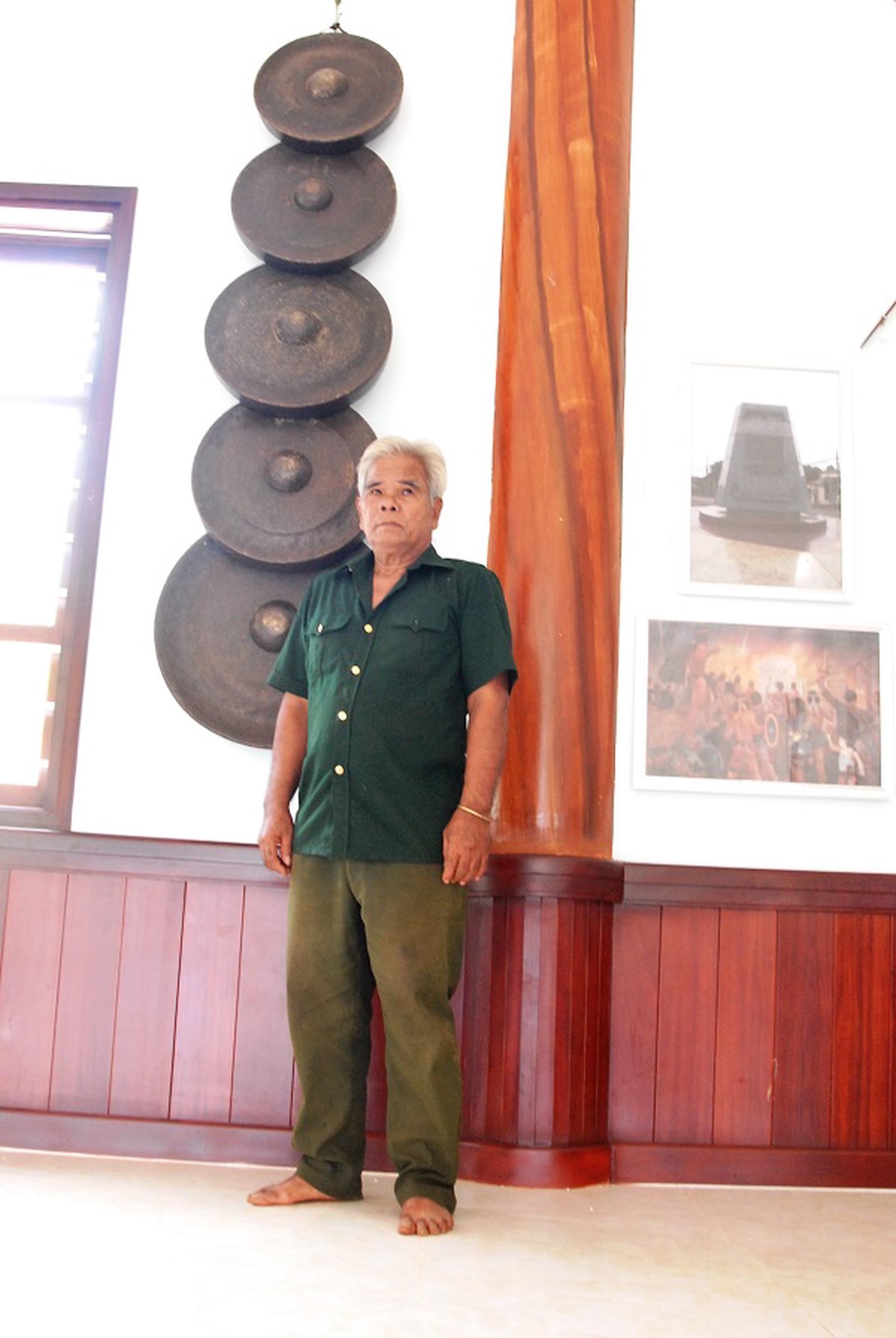 Già làng Điểu Lên bên những vật dụng truyền thống của người S'tiêng trong nhà dài ở Khu bảo tồn văn hoá dân tộc S'tiêng sóc Bom Bo. Ảnh: Bảo Trâm