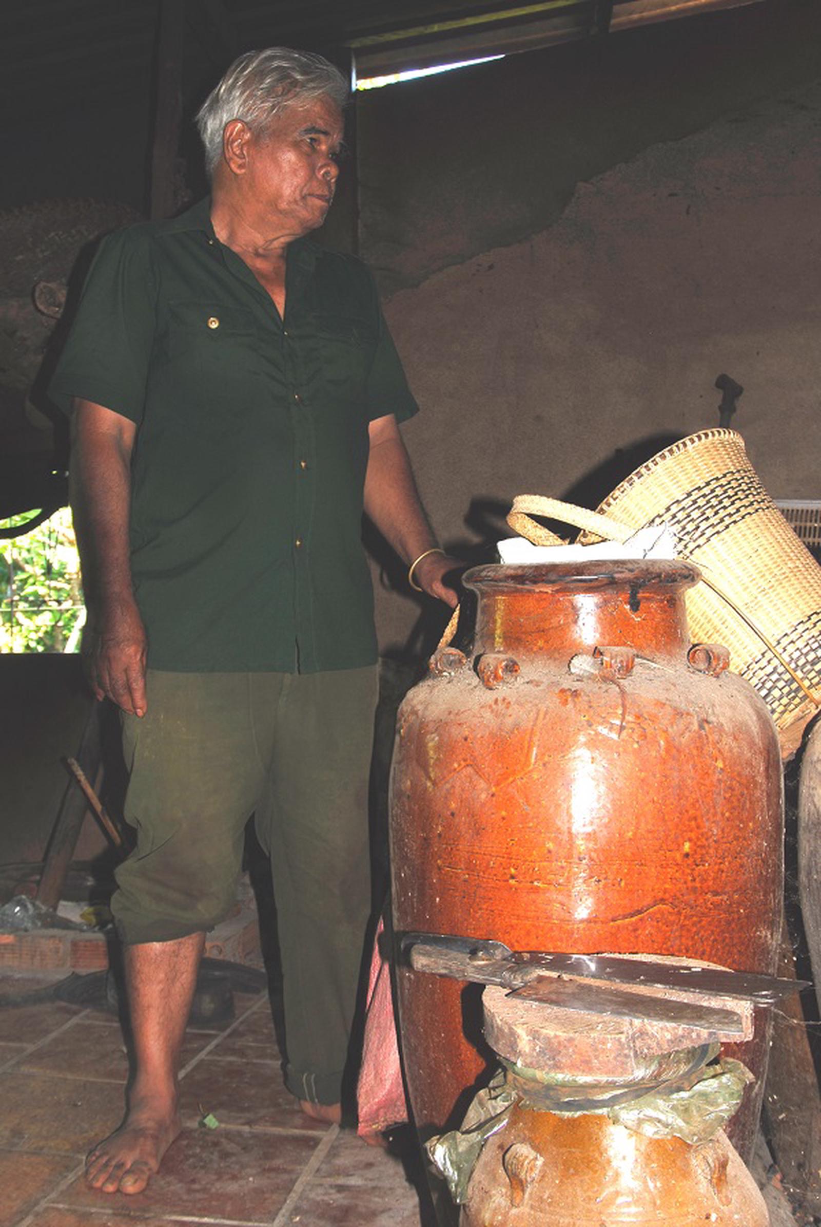 Những chum, ché, gùi được già làng Điểu Lên gìn giữ trong nhà như báu vật. Ảnh: Bảo Trâm