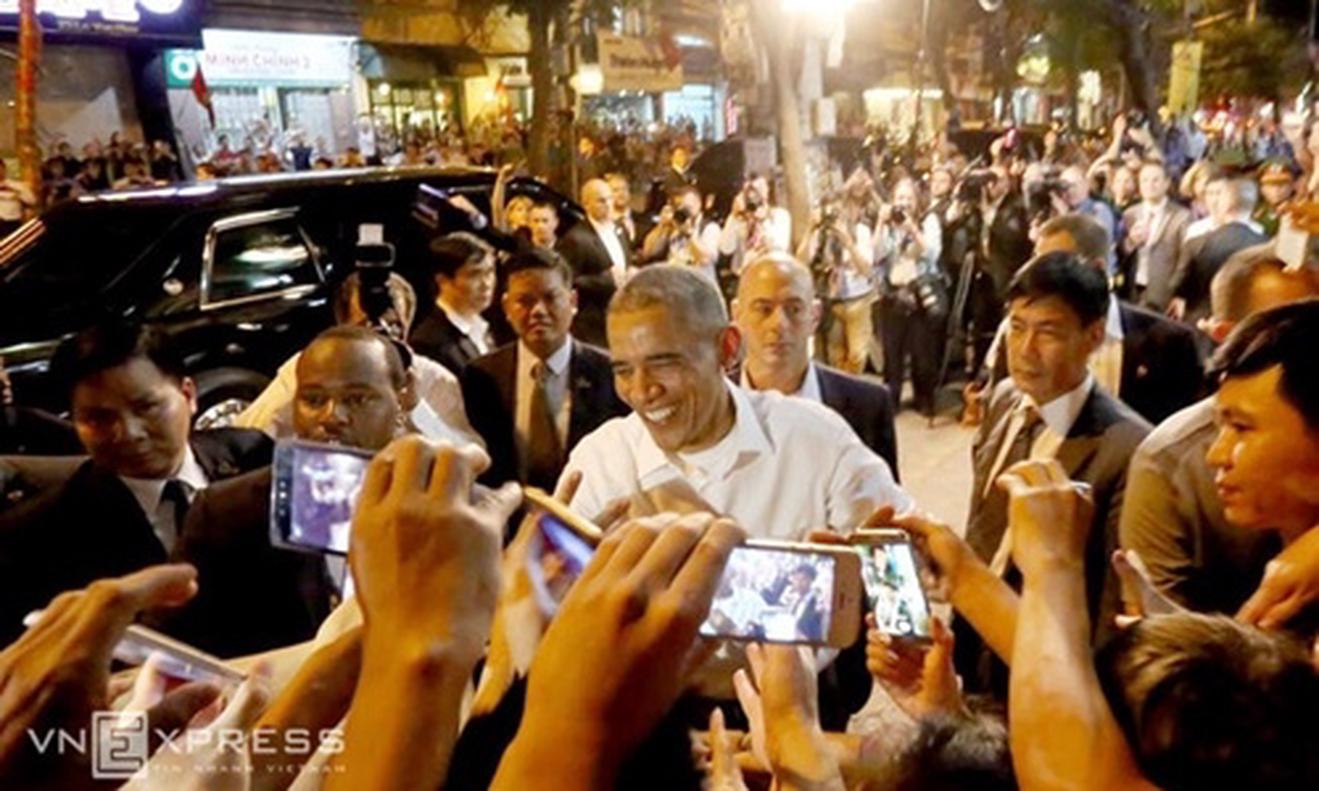 Tổng thống Mỹ Barack Obama tươi cười bắt tay, giao lưu người dân Hà Nội tối 23/5. Ảnh: Bá Đô