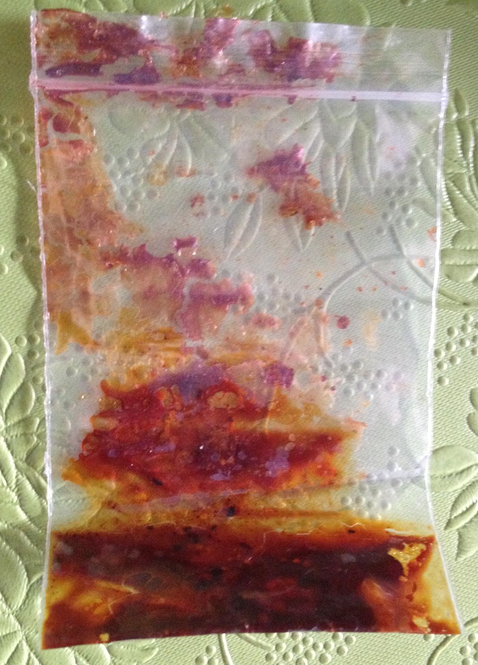 Túi nhựa đỏ được ông Bình giới thiệu là chứa mủ của si đỏ. Ảnh: Quỳnh Anh