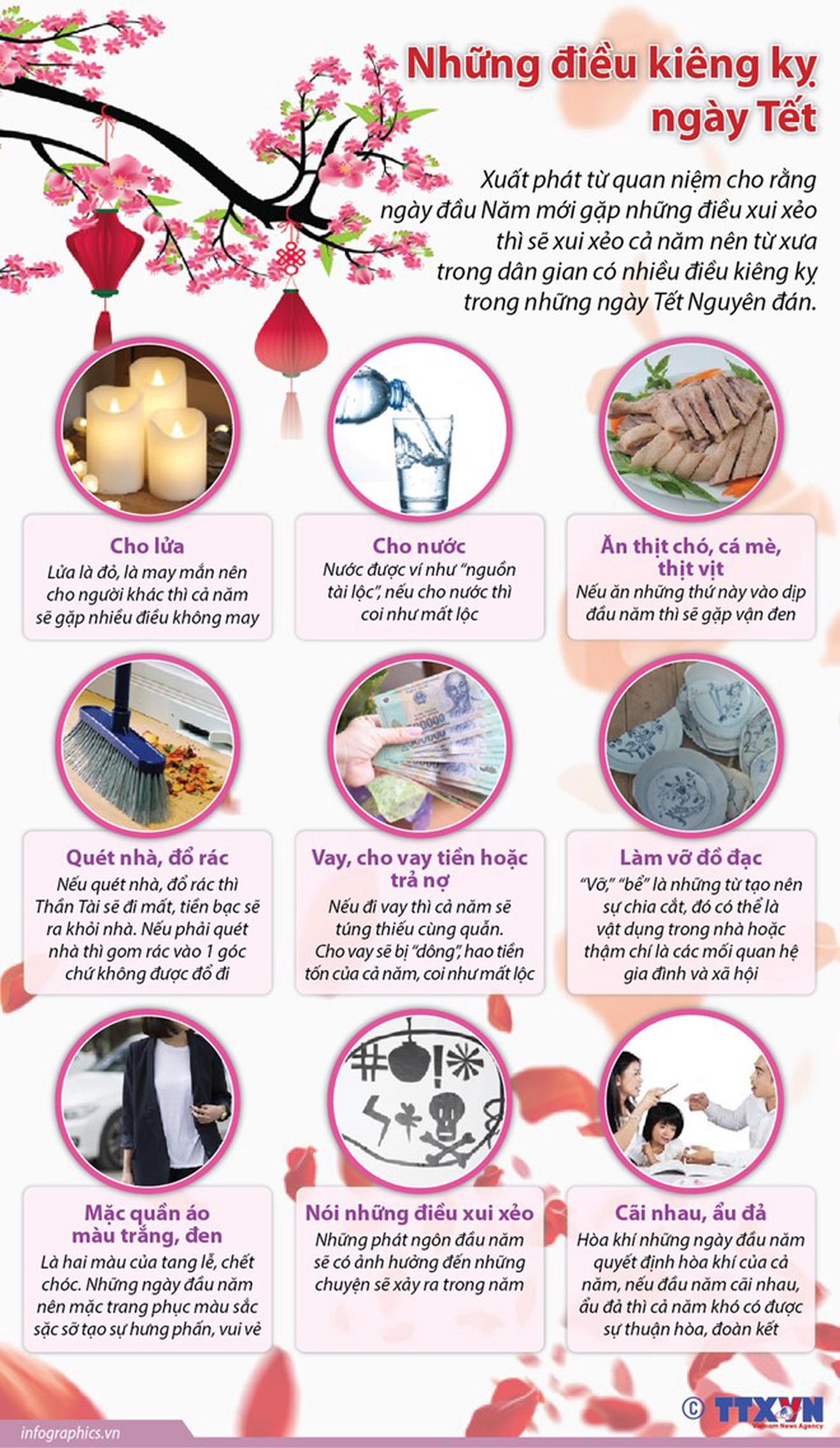 Xuất phát từ quan niệm cho rằng ngày đầu Năm mới gặp những điều xui xẻo thì sẽ xui xẻo cả năm nên từ xưa trong dân gian có nhiều điều kiêng kỵ trong những ngày Tết Nguyên đán./.