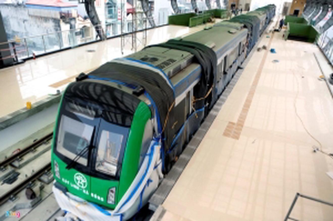 Đoàn tàu tuyến Cát Linh-Hà Đông được lắp đặt lên hệ thống ray đã 2 tháng nhưng đến nay mới lộ diện sau khi công nhân mở các tấm vải xốp phủ xung quanh.