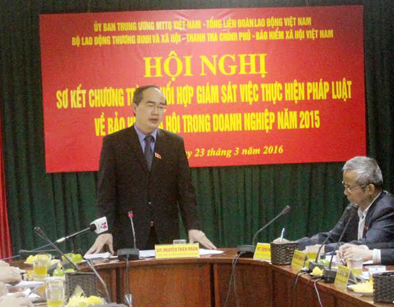 Phát biểu tại Hội nghị, Chủ tịch Mặt trận Tổ quốc Việt Nam Nguyễn Thiện Nhân đánh giá cao những kết quả 5 cơ quan đạt được trong việc thực hiện chương trình phối hợp giám sát. Qua 2 năm triển khai thực hiện đã hình thành cơ chế phối hợp ổn định cũng như góp phần giảm số nợ đọng BHXH. Tuy nhiên, những số liệu qua giám sát về tình hình đóng BHXH của DN cho người lao động là rất đáng báo động, cần có ngay giải pháp nâng cao trách nhiệm của DN đóng BHXH cho người lao động.