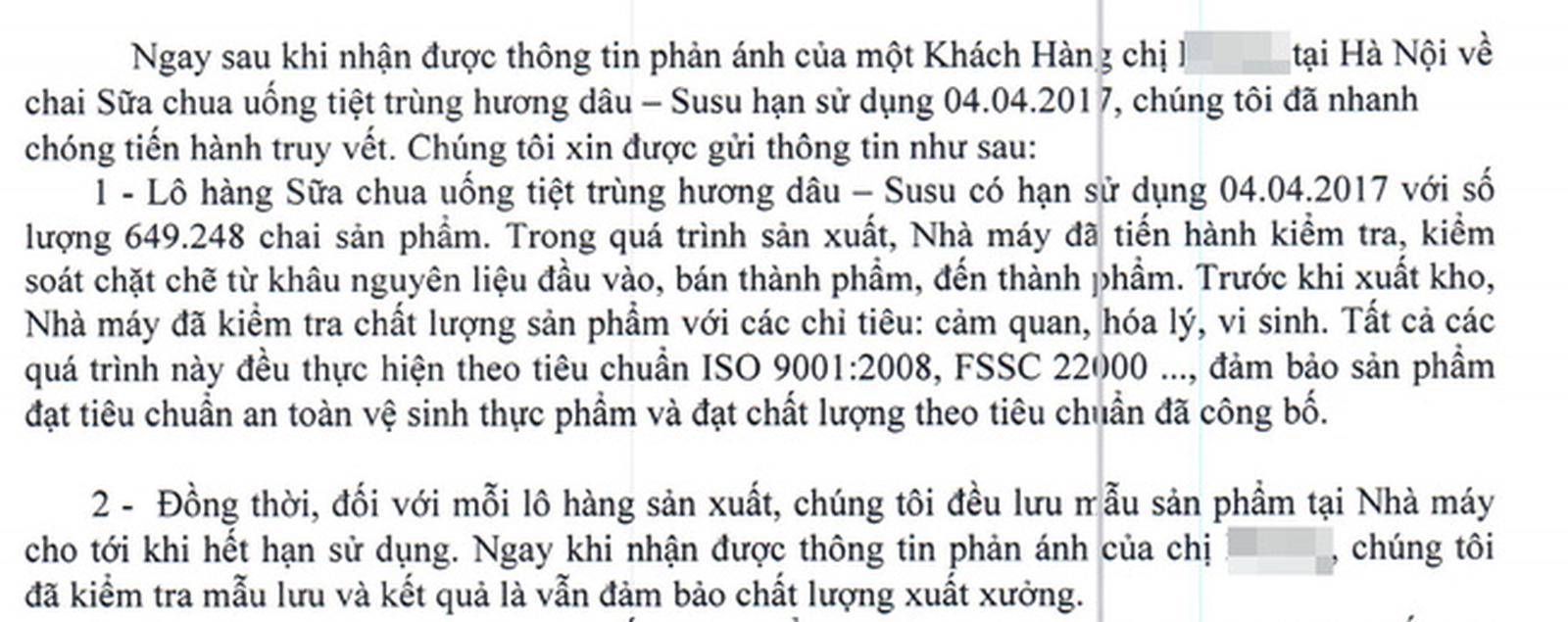 Cụ thể, đại diện Vinamilk thông tin, lô hàng sữa chua uống tiệt trùng hương dâu Susu có hạn sử dụng 4/4/2017 với số lượng 649.248 chai sản phẩm. Trong quá trình sản xuất, nhà máy đã tiến hành kiểm tra, kiểm soát chặt chẽ từ khâu nguyên liệu đầu vào, bán thành phẩm đến thành phẩm.