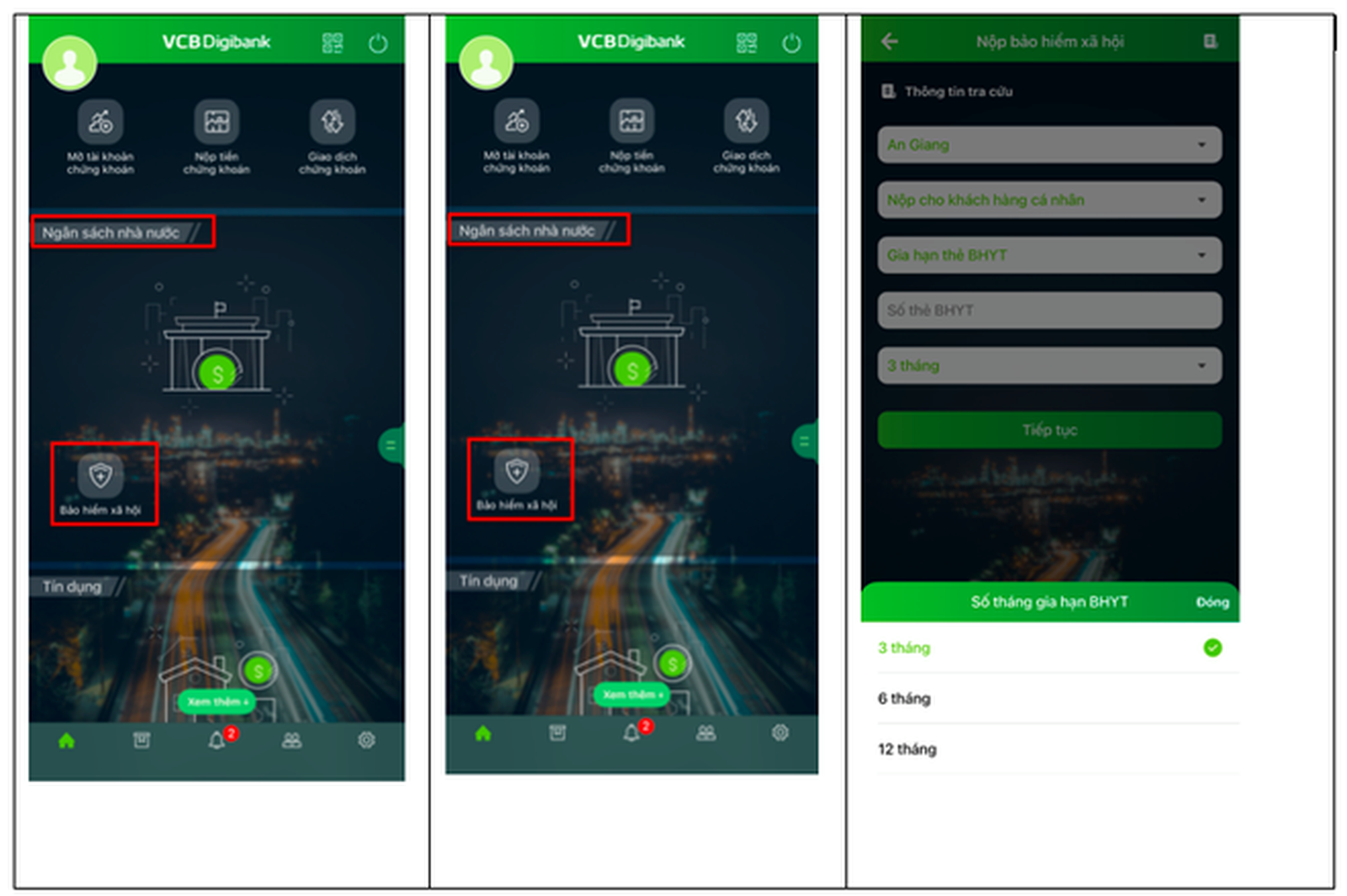 BHXH Việt Nam hướng dẫn người dân cách đóng tiếp tiền tham gia BHXH tự nguyện, đóng tiền gia hạn thẻ BHYT hộ gia đình trên ứng dụng trực tuyến của 03 ngân hàng này như sau: