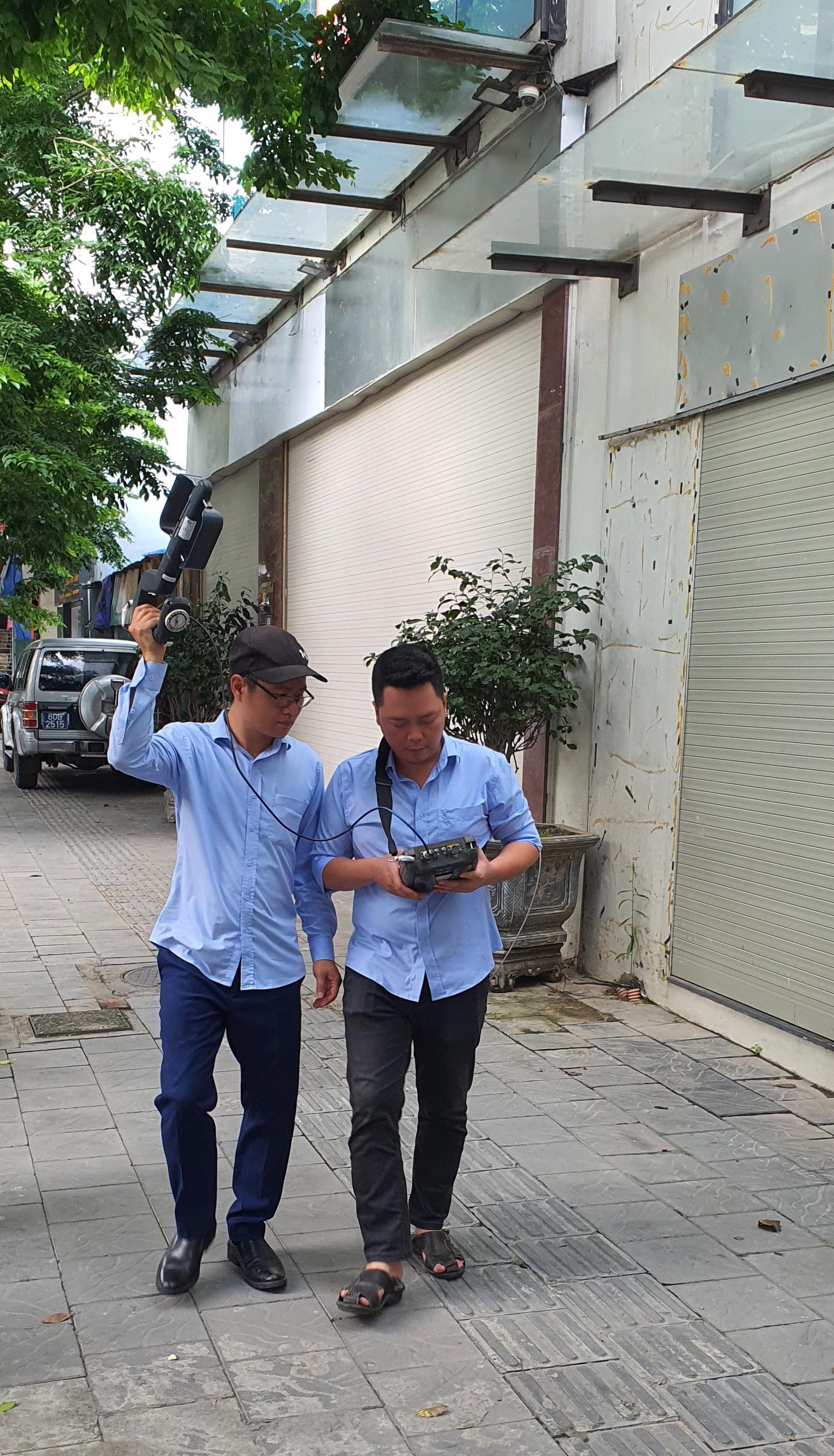 Các nhân viên kỹ thuật sử dụng thiết bị cầm tay để xác định vị trí chính xác của thiết bị phát sóng gây nhiễu. Ảnh: Hoàng Nam