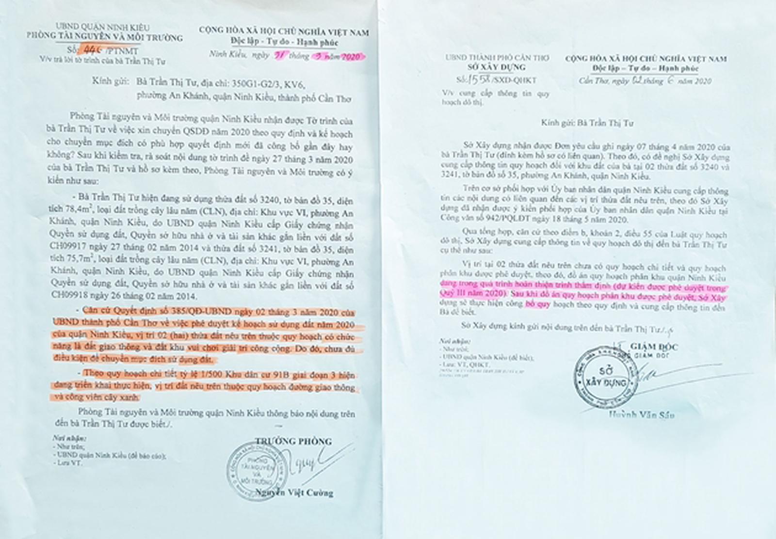 Ngày 31/3/2020, Phòng TN&MT có Văn bản số 466/PTNMT về trả lời bà Tư cho rằng, căn cứ Quyết định số 385/QĐ-UBND ngày 2/3/2020 của UBND TP Cần Thơ về việc phê duyệt kế hoạch sử dụng đất năm 2020 của quận Ninh Kiều, vị trí 2 thửa đất nêu trên thuộc quy hoạch có chức năng là đất giao thông và đất khu vui chơi giải trí công cộng. Do đó, chưa đủ điều kiện để chuyển mục đích sử dụng đất.