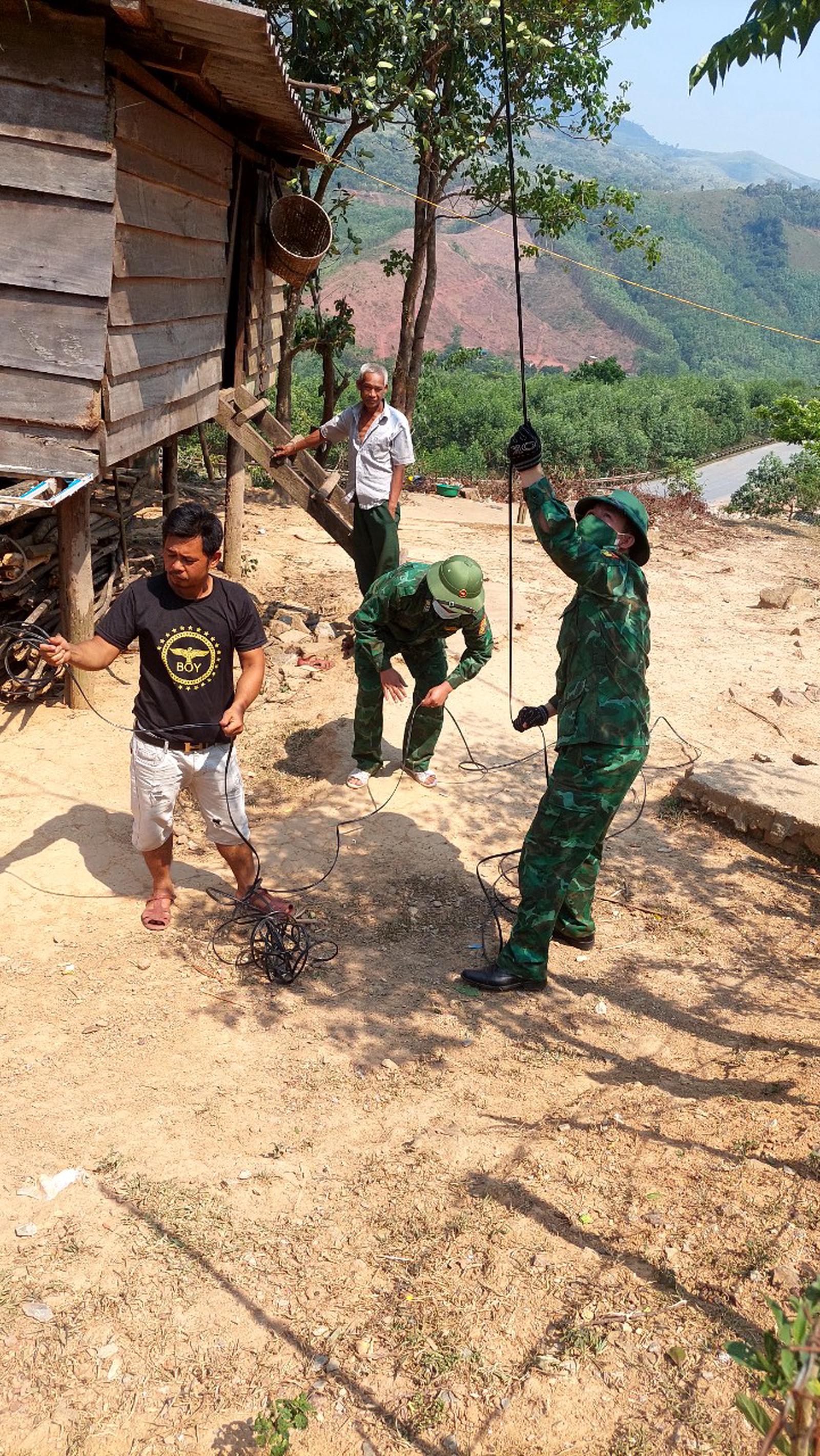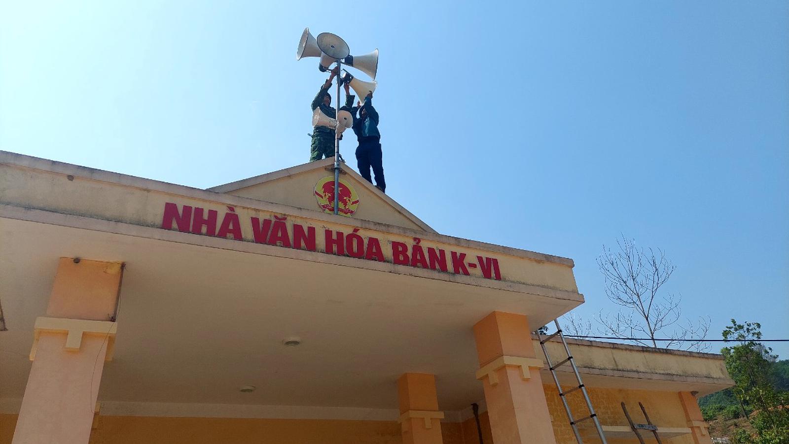 Lính Biên phòng lắp loa tại nhà văn hóa bản. Ảnh: Bùi Hải