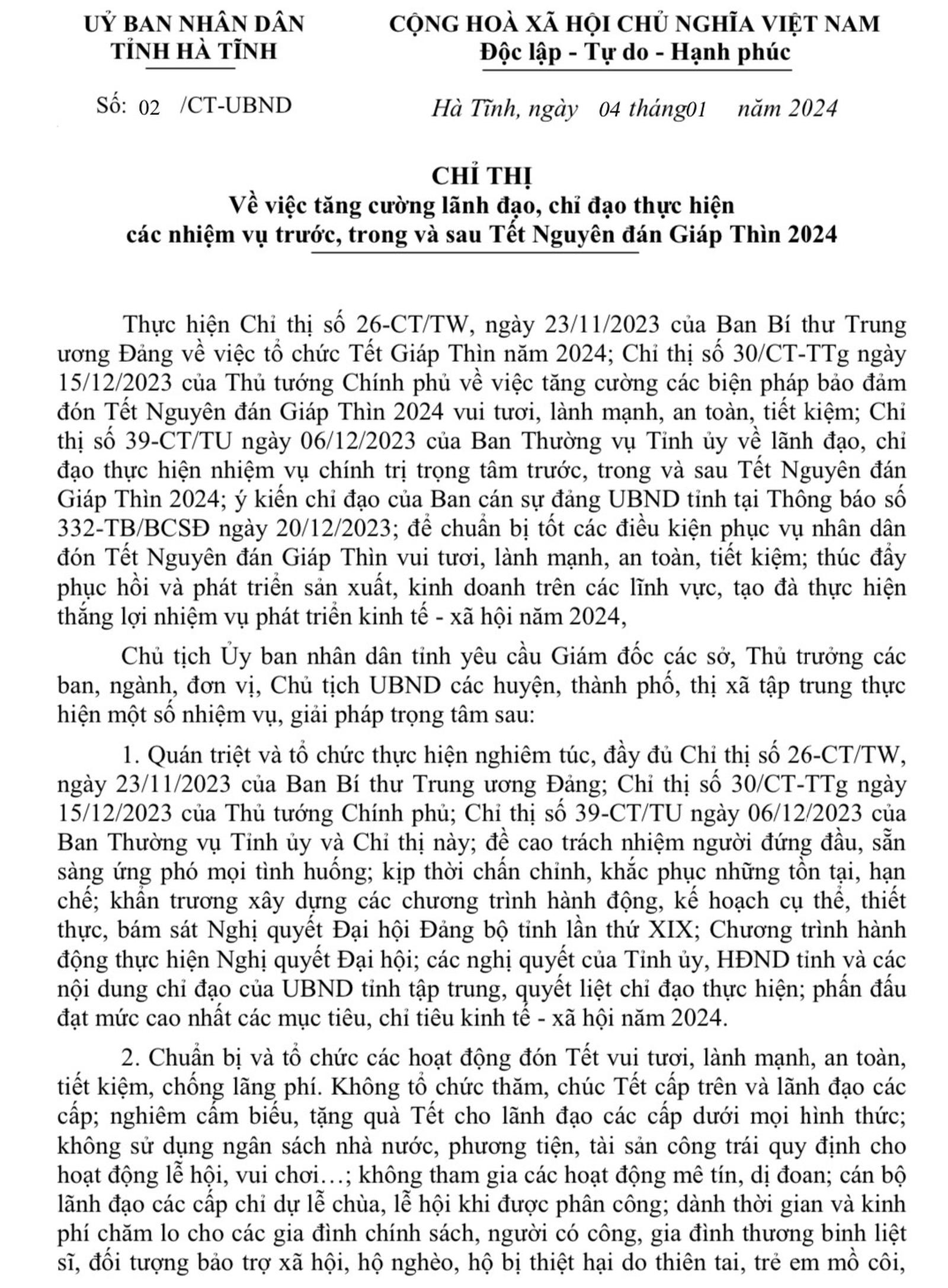 Chỉ thị số 02/CT-UBND ngày 04/01/2024 của Chủ tịch UBND tỉnh Hà Tĩnh. Ảnh: TQ