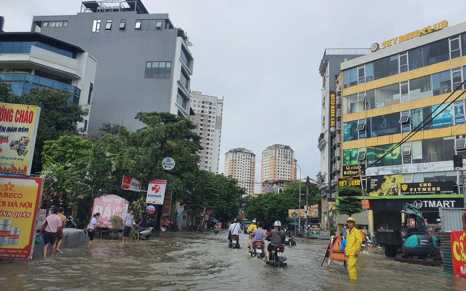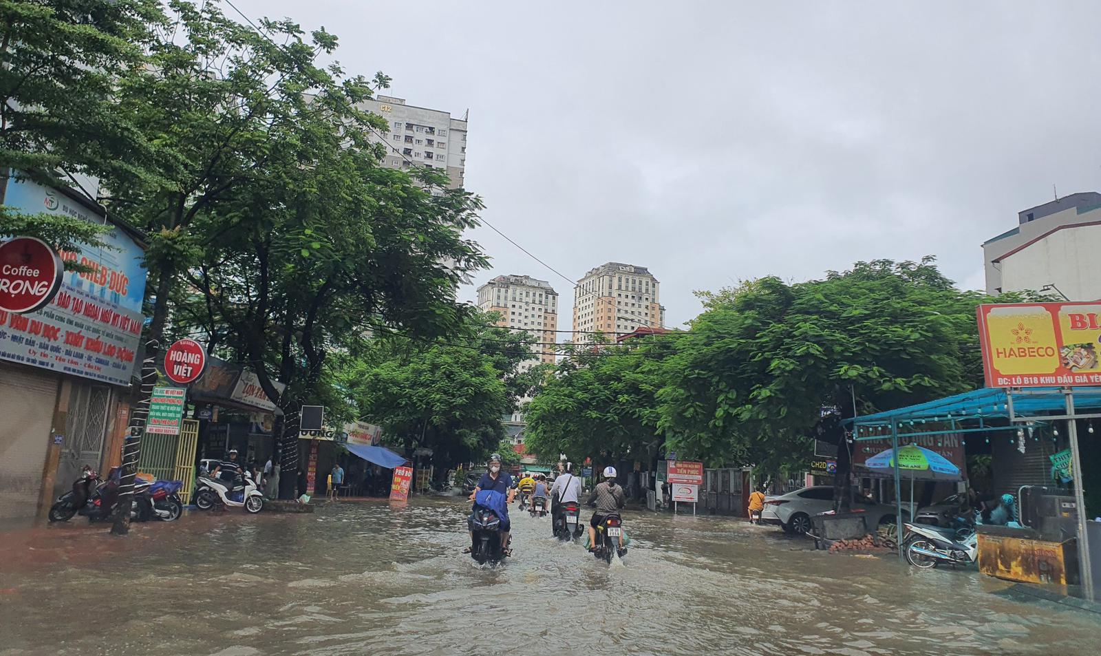 Các tuyến Phan Văn Trường, Dương Đình Nghệ (quận Cầu Giấy); tòa nhà UDIC - Võ Chí Công (quận Tây Hồ); phố Triều Khúc (huyện Thanh Trì) ngập 15cm; tuyến Phùng Hưng (quận Hà Đông) ngập 20 - 25cm.