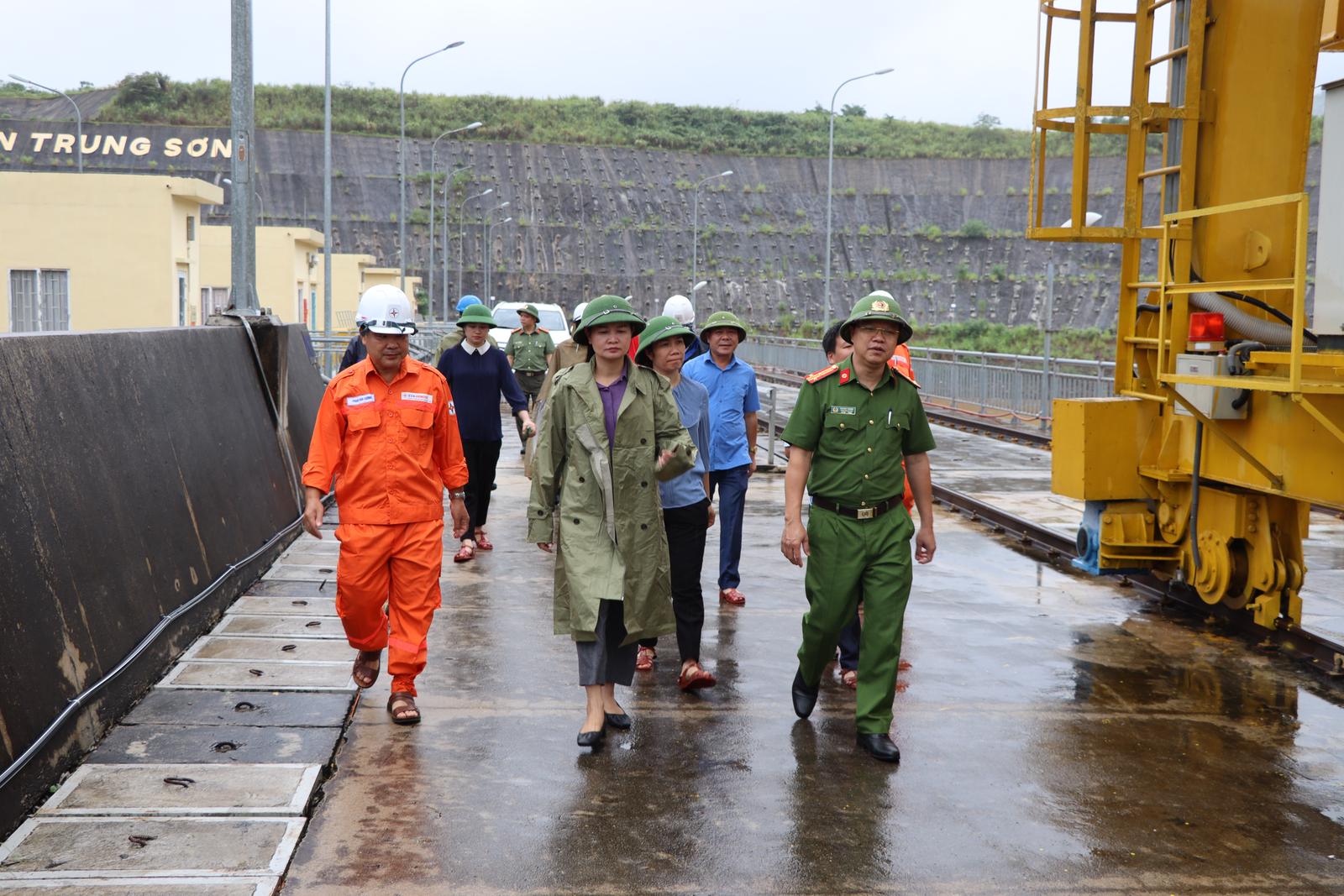 Bí thư Huyện ủy Quan Hóa Hà Thị Hương và các cơ quan chức năng kiểm tra, khắc phục hậu quả bão lũ. Ảnh: VT