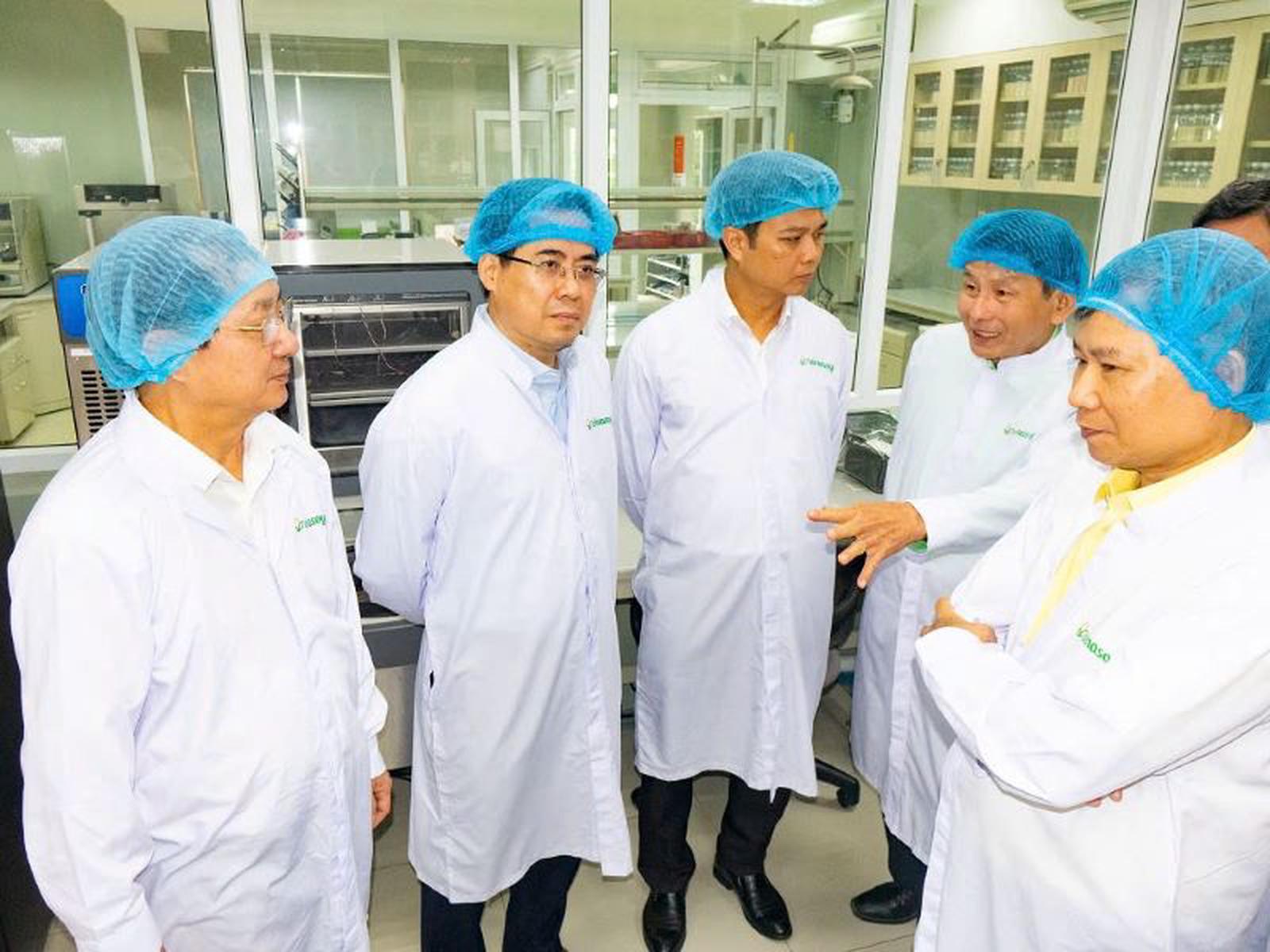 Bộ trưởng Bộ KH&CN Huỳnh Thành Đạt và Chủ tịch UBND tỉnh Quảng Ngãi Nguyễn Hoàng Giang tham quan phòng thí nghiệm của Nhà máy Sữa đậu nành Vinasoy (Công ty Cổ phần Đường Quảng Ngãi). Ảnh: M.H