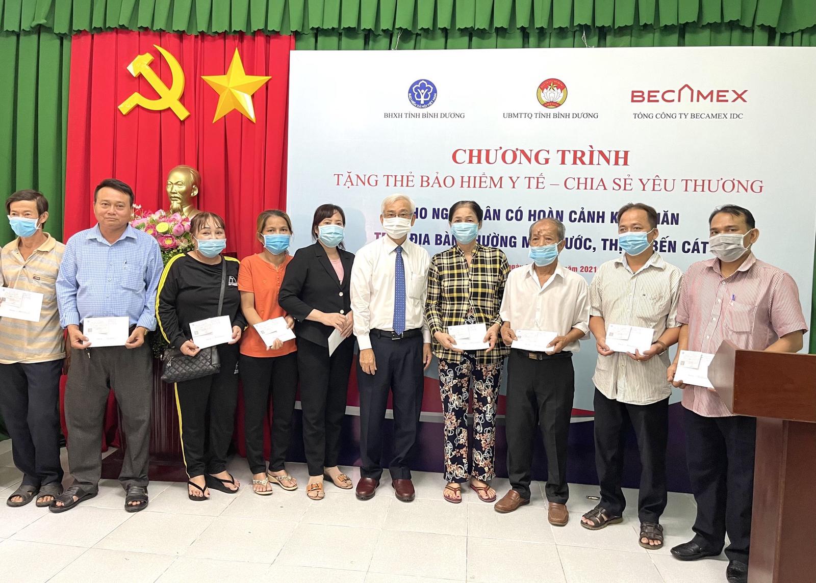 (Thanh tra) - Ngày 9/4/2021, Tổng Công ty Becamex IDC phối hợp với Ủy ban Mặt trận Tổ quốc Việt Nam tỉnh và Bảo hiểm Xã hội tỉnh Bình Dương tổ chức trao tặng 1.000 thẻ bảo hiểm y tế (BHYT) cho người dân có hoàn cảnh khó khăn do dịch bệnh Covid-19 tại 4 phường: Hòa Lợi, Thới Hòa, Mỹ Phước, Chánh Phú Hòa của Thị xã Bến Cát.