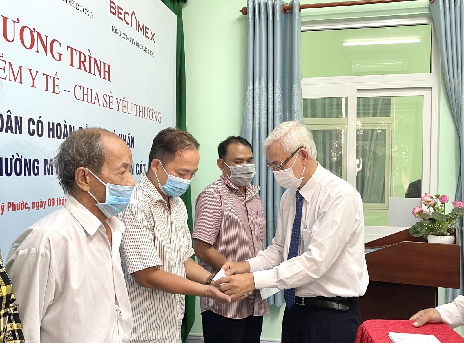 Ông Phạm Ngọc Thuận, Tổng Giám đốc Công ty Becamex IDC trao thẻ BHYT cho người dân. (Ảnh: BTC)