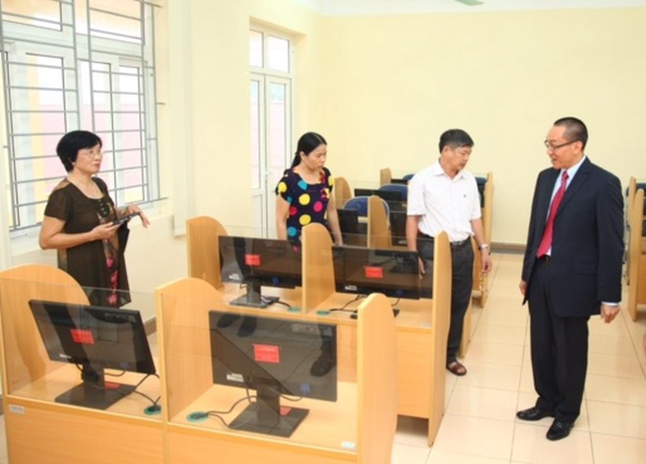 Tổng Giám đốc Chung Bá Phương (người mặc vest) cùng các đại biểu tham quan phòng Tin học do Generali tài trợ