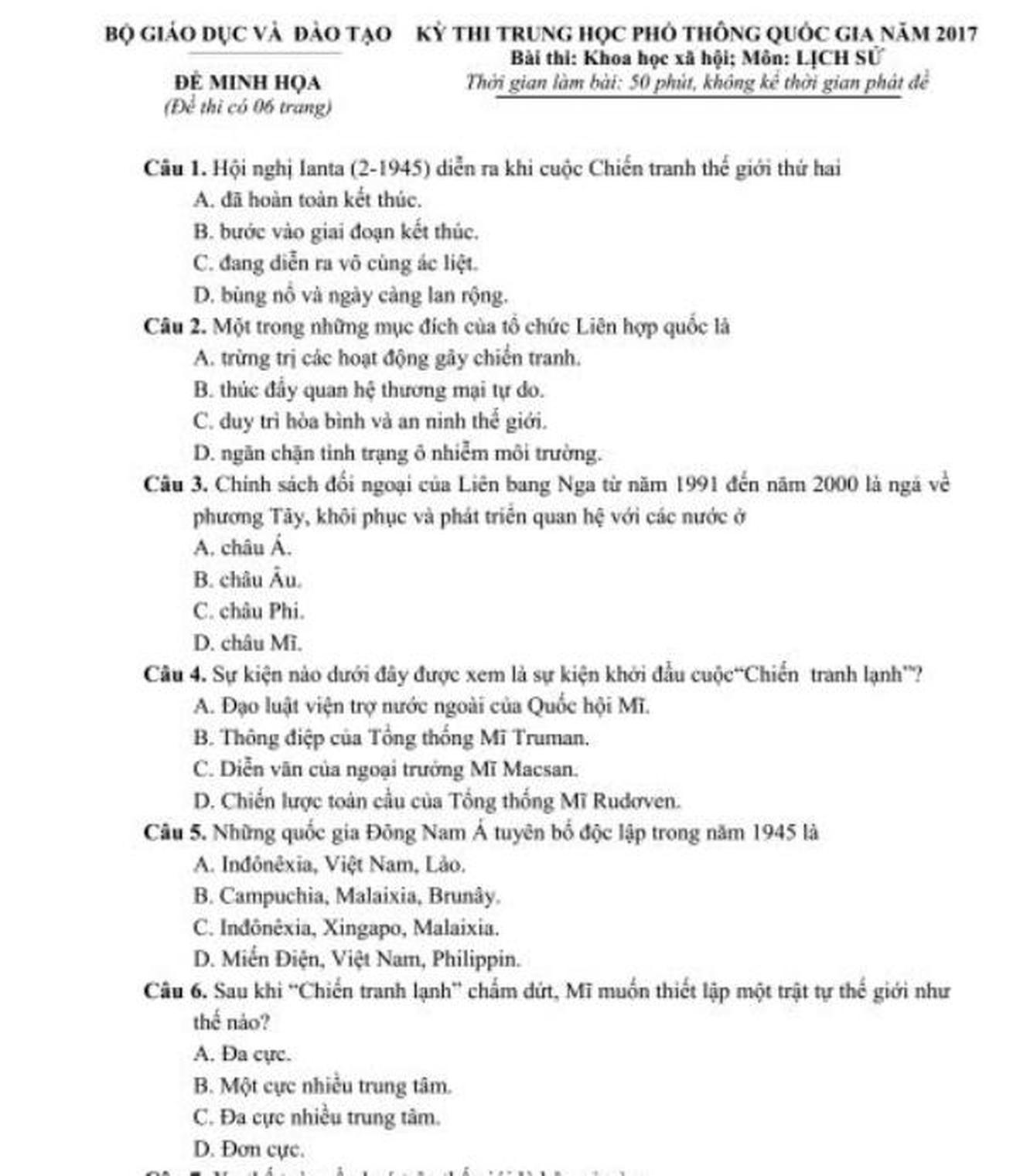 Theo đề thi minh họa Bộ Giáo dục và Đào tạo (GD&ĐT) mới công bố, đề thi môn Lịch sử có 40 câu với thời lượng 50 phút. Trong đó, câu hỏi về lịch sử thế giới có 11 câu (chiếm 27,5%), lịch sử Việt Nam 28 câu (chiếm 70%), còn lại là “giao thoa” giữa lịch sử Việt Nam và thế giới. Đề thi chiếm đại đa số là câu hỏi về nội dung sự kiện, chỉ có 2 câu hỏi yêu cầu học sinh phải tư duy. Về mặt hình thức, các câu hỏi được thiết kế dưới 3 dạng chủ yếu là điền khuyết, sắp xếp theo trật tự thời gian và tìm lựa chọn đúng.