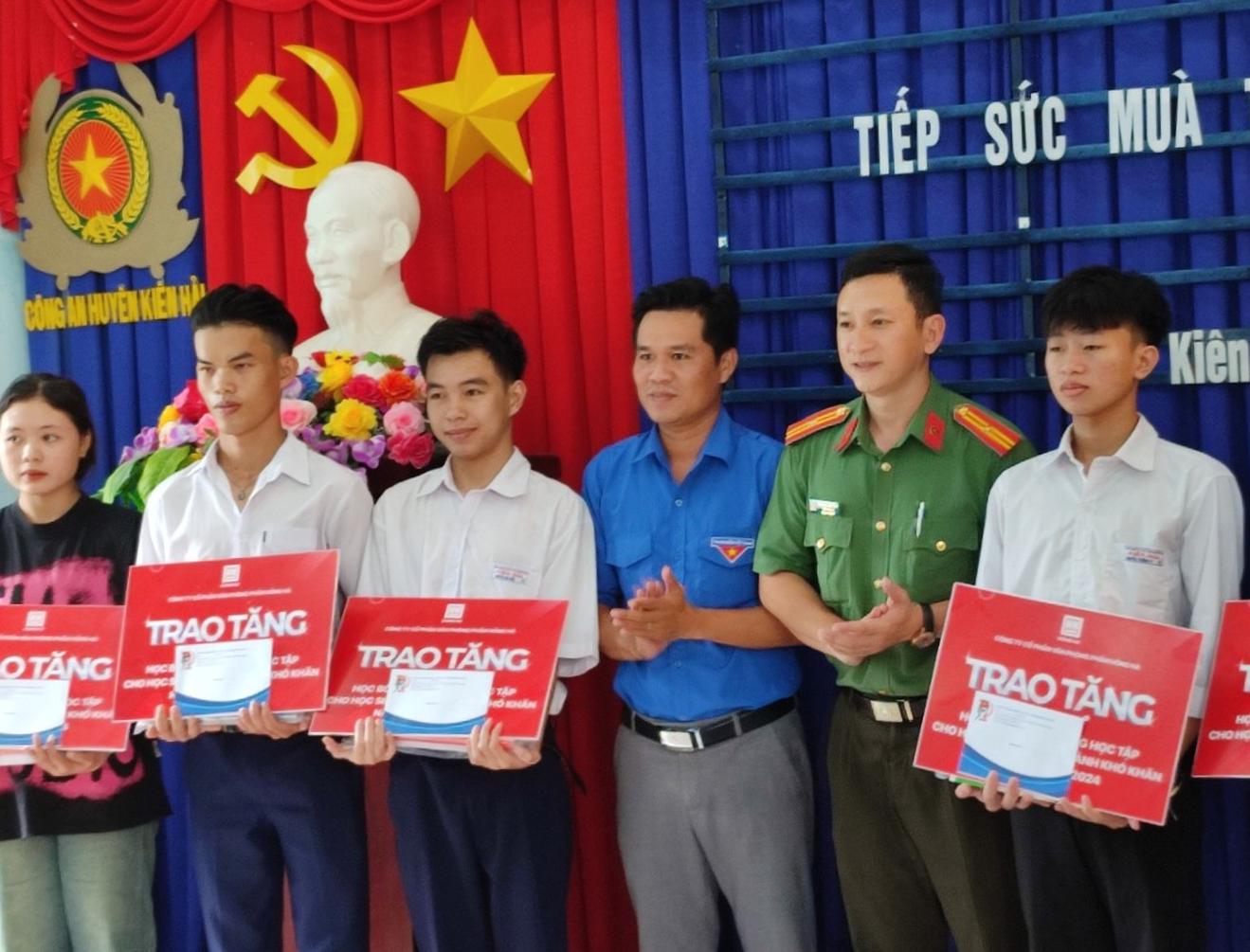 Dịp này, Ban Thanh niên Công an tỉnh vận động Công ty Cổ phần Văn phòng phẩm Hồng Hà (Hà Nội) tặng 12 suất học bổng và đồ dùng học tập phục vụ cho các em tham gia kỳ thi tốt nghiệp THPT năm 2024 cho các em học sinh có hoàn cảnh khó khăn của Trường THCS và THPT Kiên Hải.