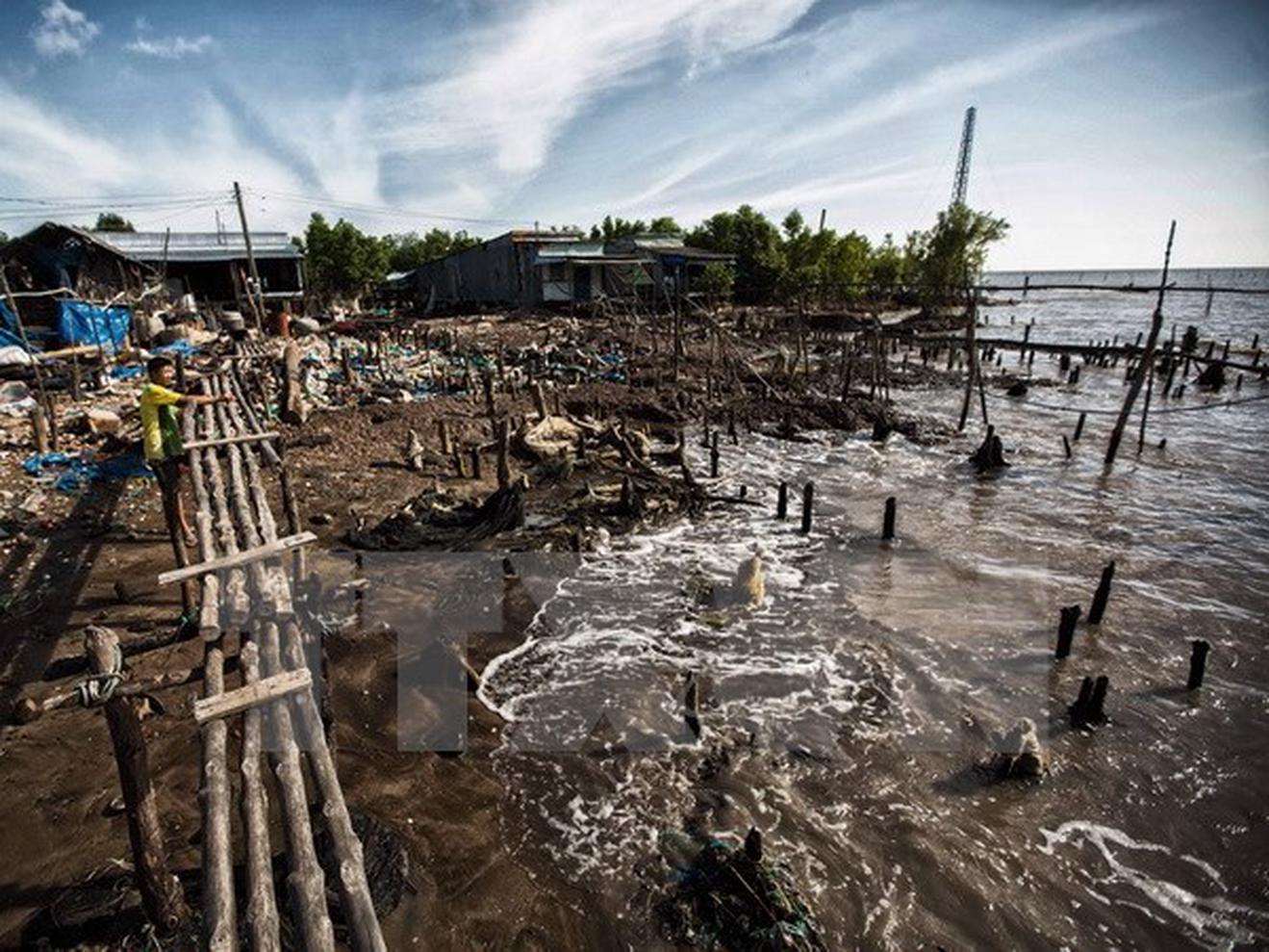 Khung cảnh đổ nát hoang tàn ở ấp Kênh Đào Đông, xã Đất Mũi do tốc độ xói lở quá nhanh của biển khiến người dân không kịp trở tay. (Ảnh: Trọng Đạt/TTXVN)