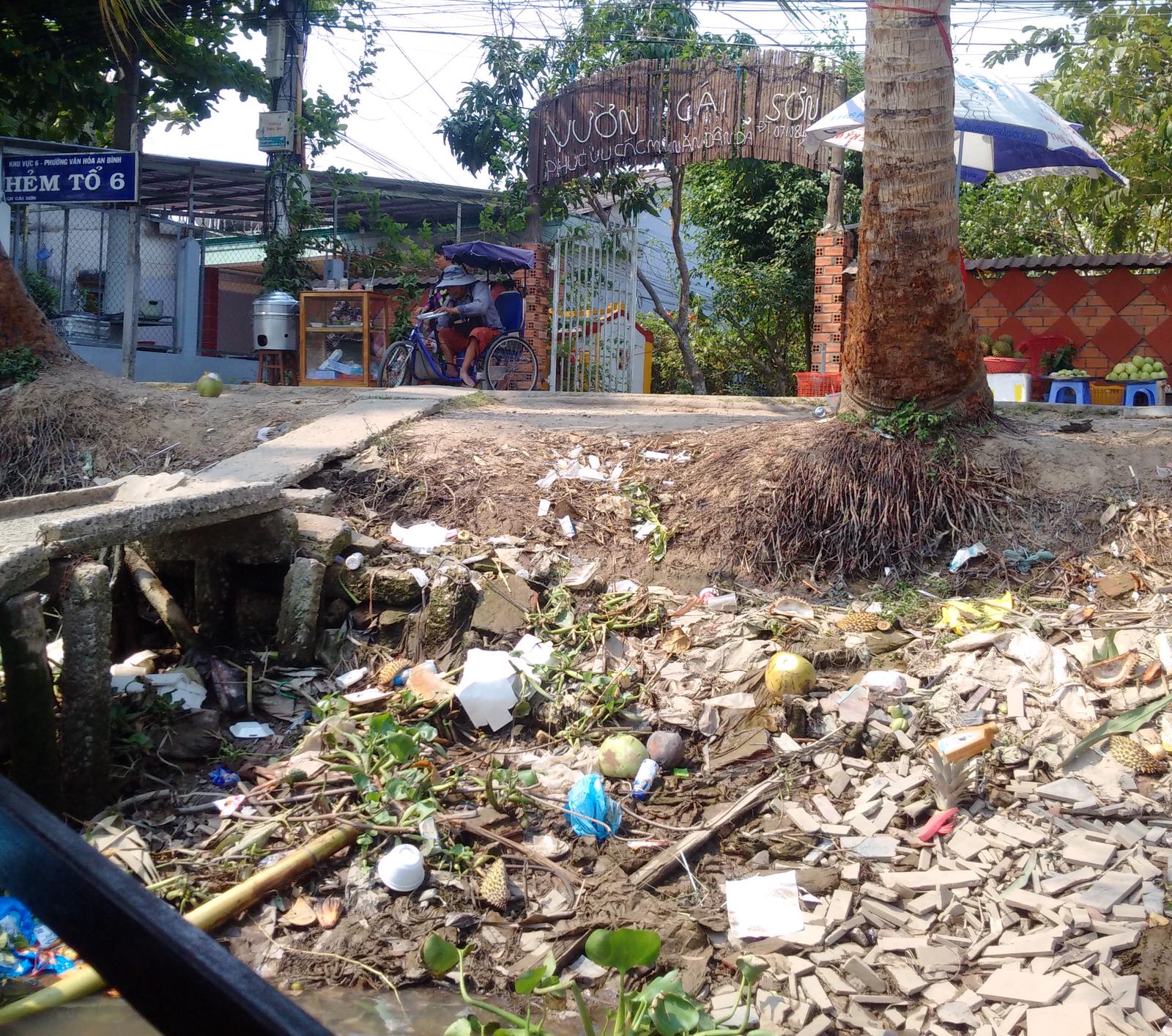 Thế nhưng, ngay trước lối vào điểm du lịch, bên con rạch Cái Sơn, đập vào mắt du khách là ngổn ngang rác thải sinh hoạt, rác thải xây dựng. Người dân và các cơ sở sản xuất thiếu ý thức đã xả rác thải xuống dòng sông, kênh rạch. Rác “di cư” theo con nước và dạt vào hai bên bờ, tạo nên những bờ sông, bờ rạch nhếch nhác và bẩn thỉu.