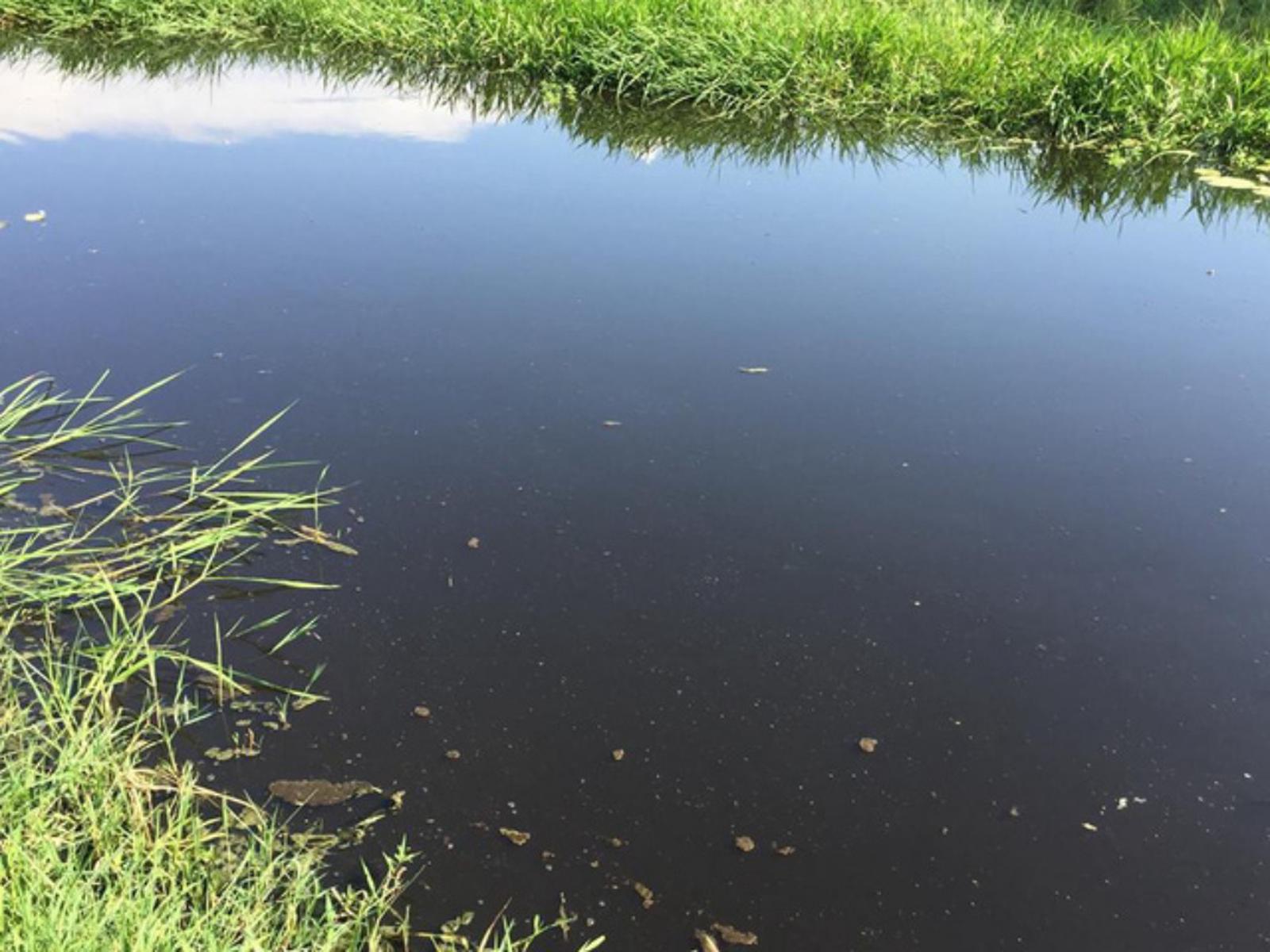 Đi dọc bờ kênh xuống khu vực xã Hồng Lộc, chúng tôi cũng phát hiện nguồn nước ở đây bị nhiễm bẩn, nước màu xanh đục, có đoạn đổi sang đen sẫm, váng nổi bầy nhầy, một số cá chết nổi trên mặt nước.