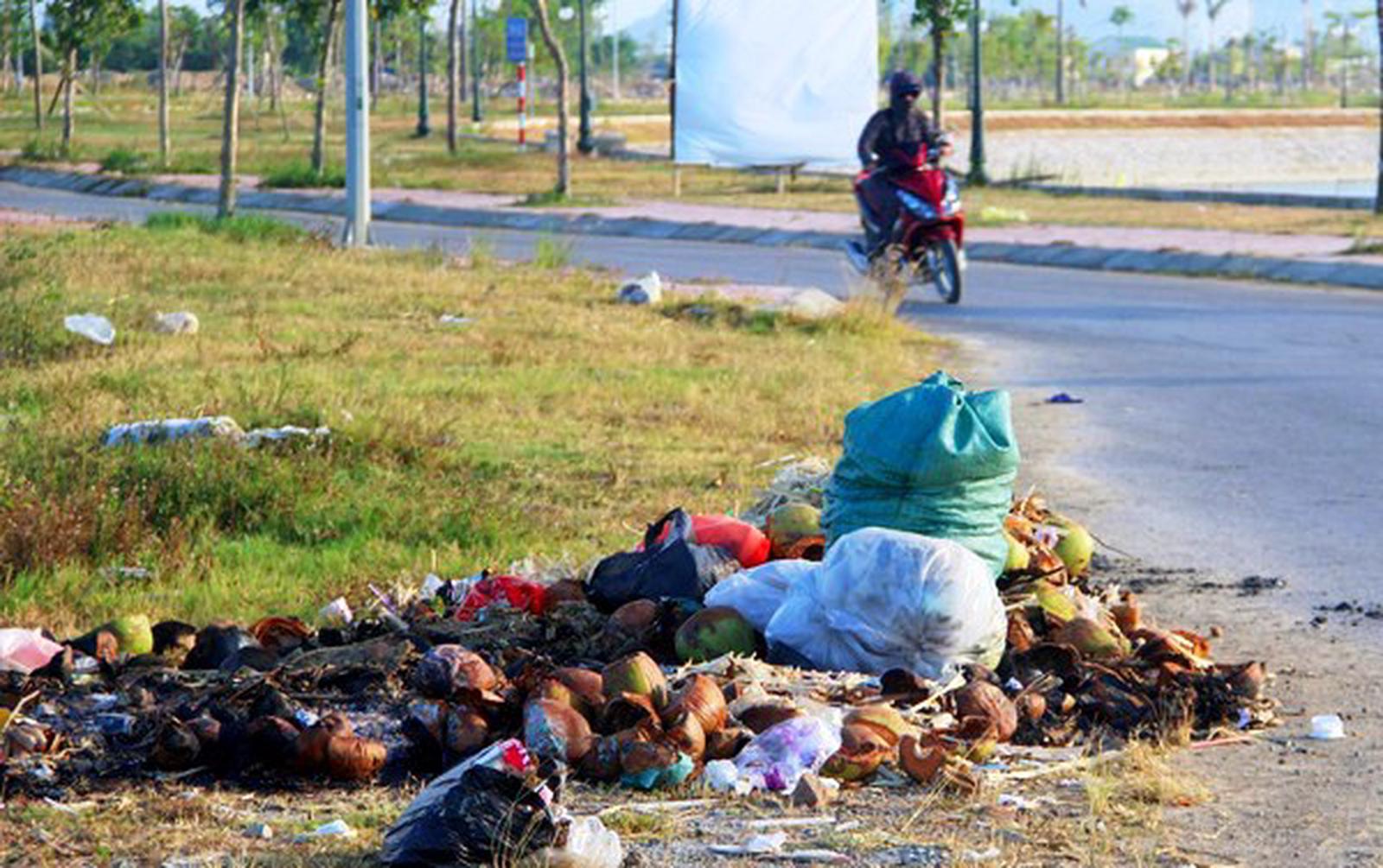 Bên cạnh cá chết dưới mặt hồ, xung quanh khu vực hồ điều hòa cũng ngập đầy rác thải. Các túi ni lông khó phân hủy bị vứt bừa bãi. Điều đáng nói, khu vực hồ có diện tích lên đến 53 ha nhưng không hề có thùng đựng rác. Nhiều người tập trung ăn uống đã vô ý thức bỏ lại rác thải bên cạnh hồ.