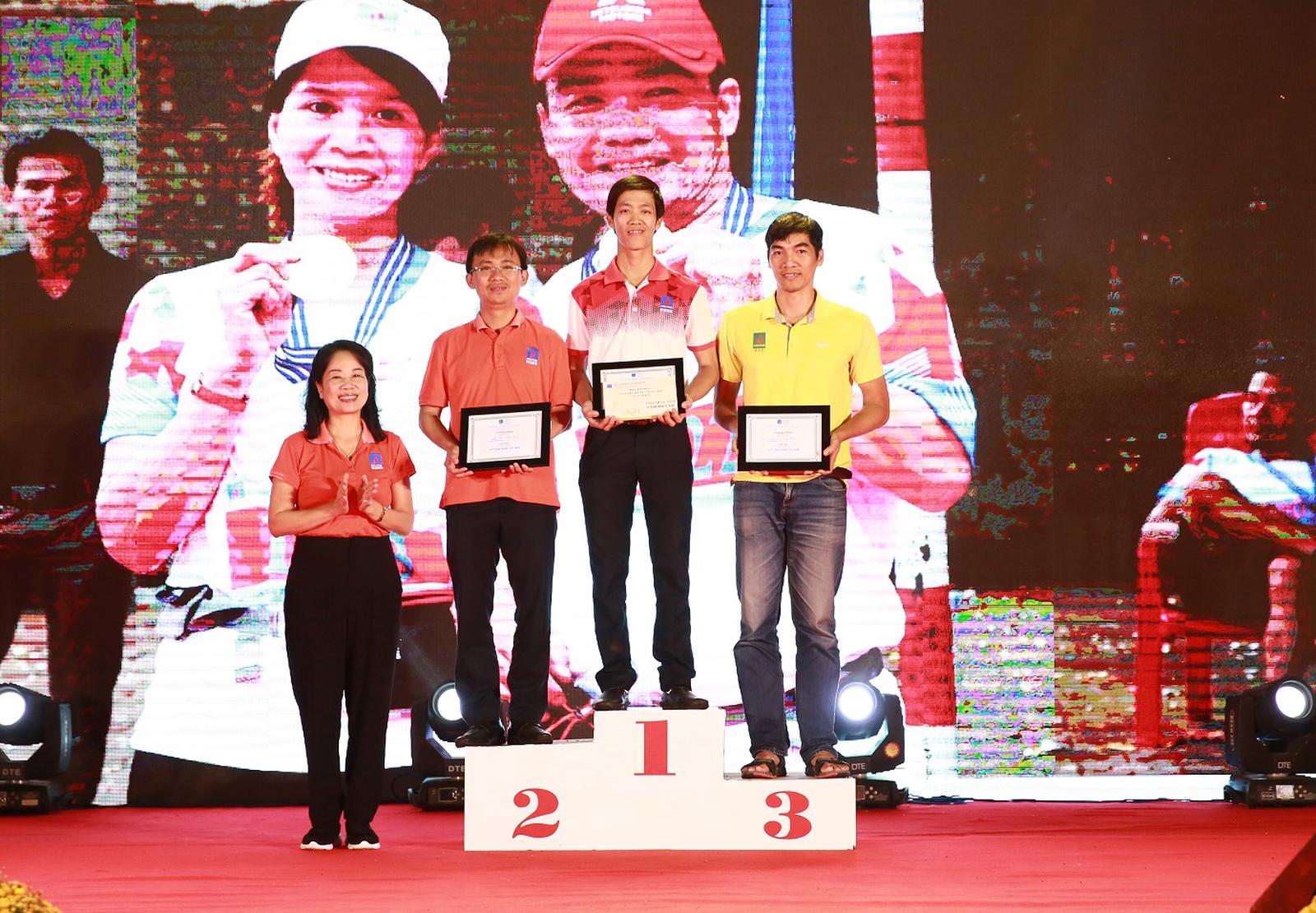 Bà Khuất Thị Lê, Chủ tịch Công đoàn BSR trao giải cho các nam VĐV đạt giải ở cự ly 3km.