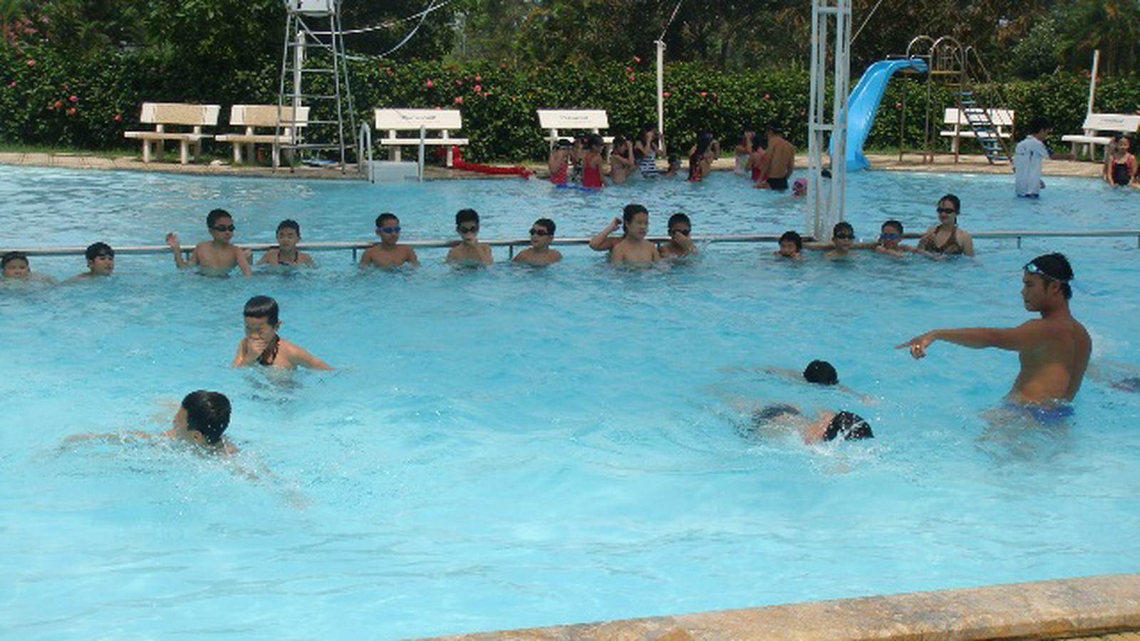 Cac huấn luyện viên đang hướng dẫn học viên tham gia học bơi